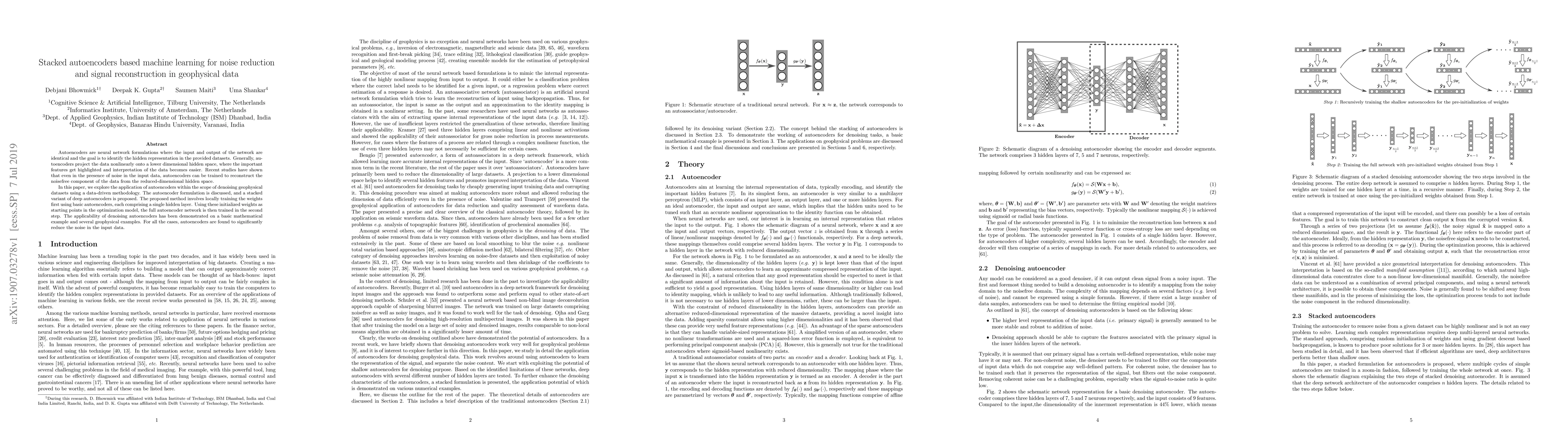 This paper proposes a stacked autoencoder approach for denoising and reconstructing geophysical data, demonstrating its effectiveness through both mathematical and geophysical examples. The method involves local training of basic autoencoders followed by global training of the full network, significantly reducing noise in the datasets.