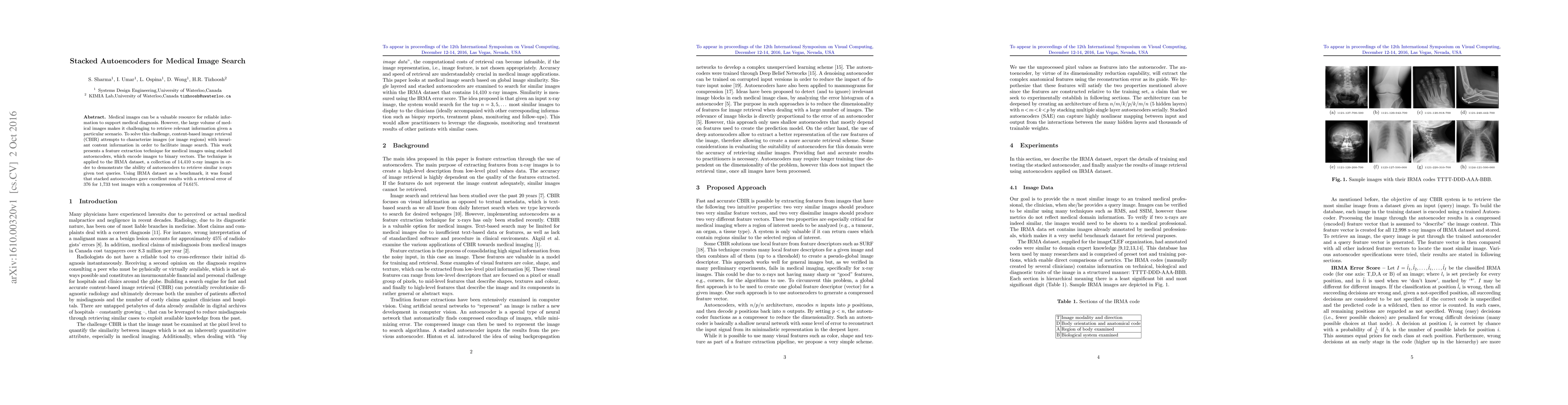 Stacked autoencoders were used to extract features from medical images in a feature extraction technique that can help with image search. The method showed excellent results in retrieving similar x-rays given test queries with a high compression rate.