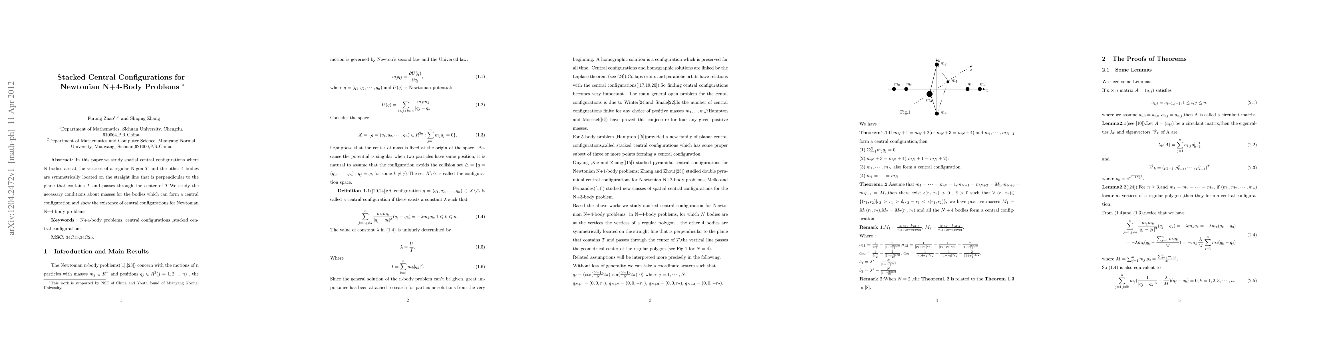 In this paper,we study spatial central configurations where N bodies are at the vertices of a regular N-gon $T$ and the other 4 bodies are symmetrically located on the straight line that is perpendicular to the plane that contains $T$ and passes through the center of $T$.We study the necessary conditions about masses for the bodies which can form a central configuration and show the existence of central configurations for Newtonian N+4-body problems.