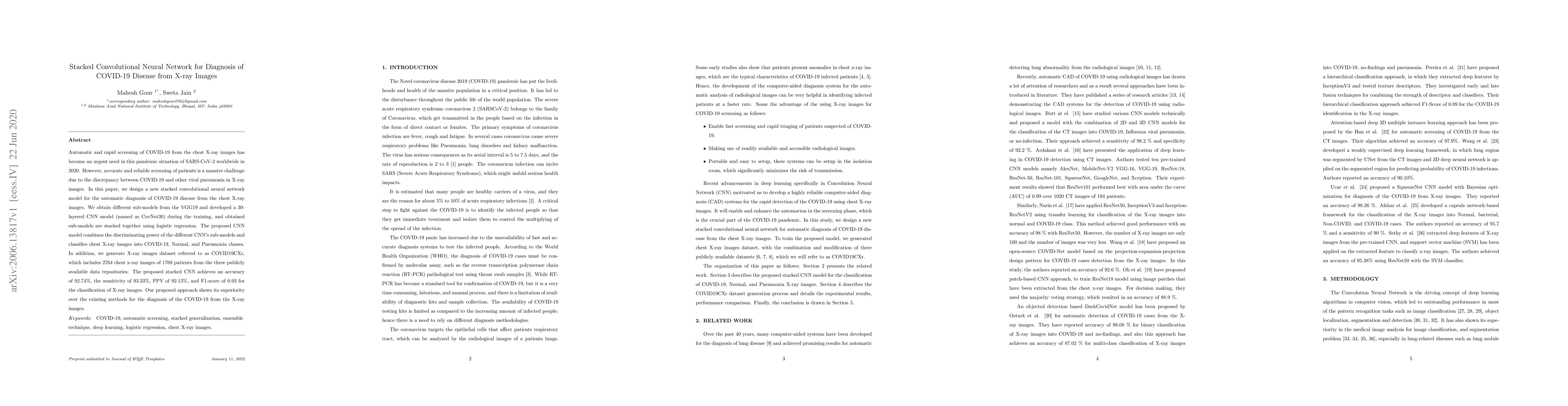 This paper proposes a stacked convolutional neural network (CovNet30) model for diagnosing COVID-19 from chest X-ray images, combining sub-models from VGG19 and logistic regression. The model achieves an accuracy of 92.74%, demonstrating superior performance over existing methods.