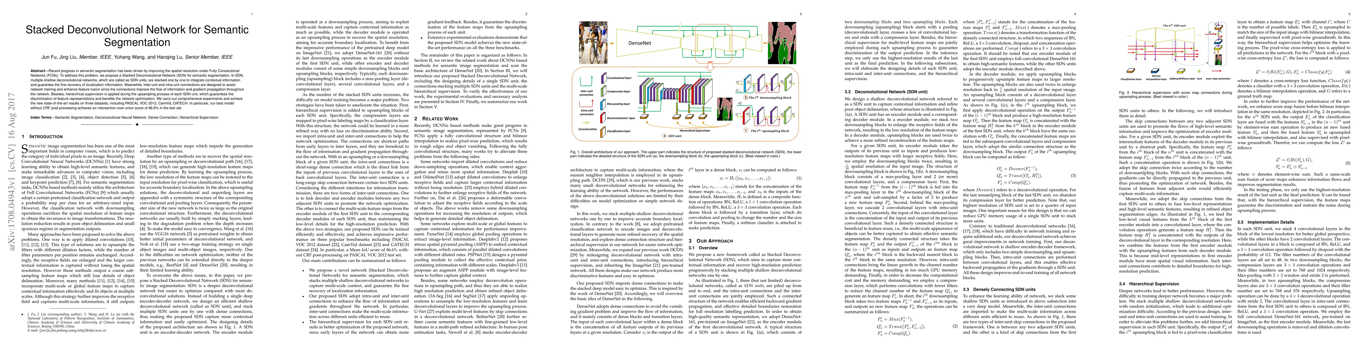 A new neural network architecture called Stacked Deconvolutional Network improves semantic segmentation accuracy by combining contextual information from multiple shallow networks. It achieves state-of-the-art results on three popular datasets with an intersection-over-union score of 86.6%.