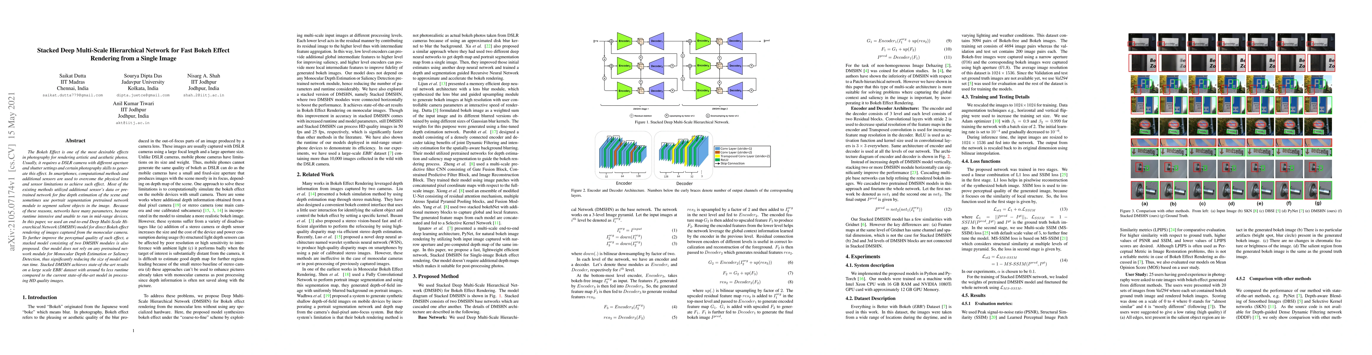 This research introduces a Deep Multi-Scale Hierarchical Network (DMSHN) for rendering the Bokeh effect from a single image captured by a monocular camera, without relying on pretrained networks for depth estimation or saliency detection. A stacked model of two DMSHN modules further enhances perceptual quality. The proposed method achieves state-of-the-art results on the EBB! dataset, with significantly reduced model size and runtime compared to existing methods.