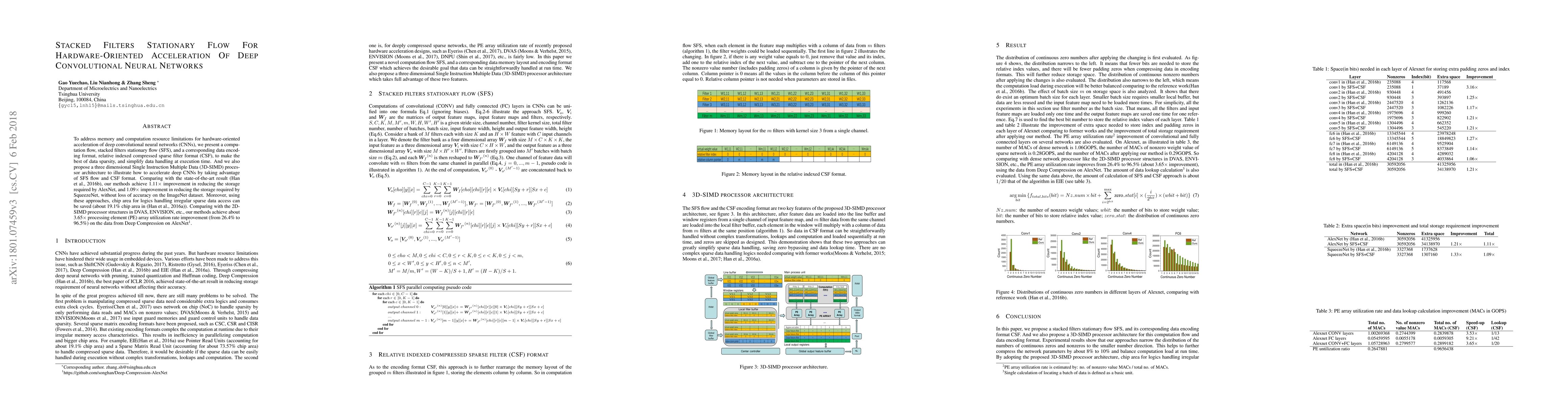 This paper introduces a stacked filters stationary flow (SFS) and a relative indexed compressed sparse filter format (CSF) to optimize memory and computation for hardware-oriented deep CNN acceleration. The proposed 3D-SIMD architecture enhances processing efficiency, achieving significant reductions in storage and improved processing element utilization compared to existing methods.