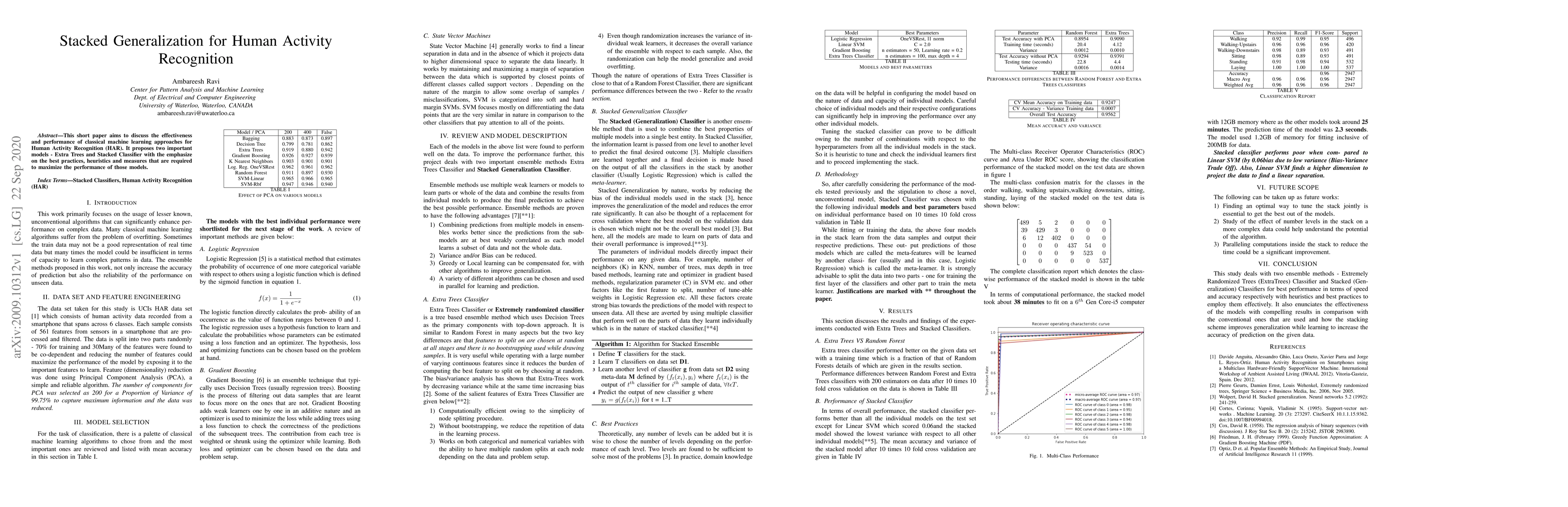 This short paper aims to discuss the effectiveness and performance of classical machine learning approaches for Human Activity Recognition (HAR). It proposes two important models - Extra Trees and Stacked Classifier with the emphasize on the best practices, heuristics and measures that are required to maximize the performance of those models.