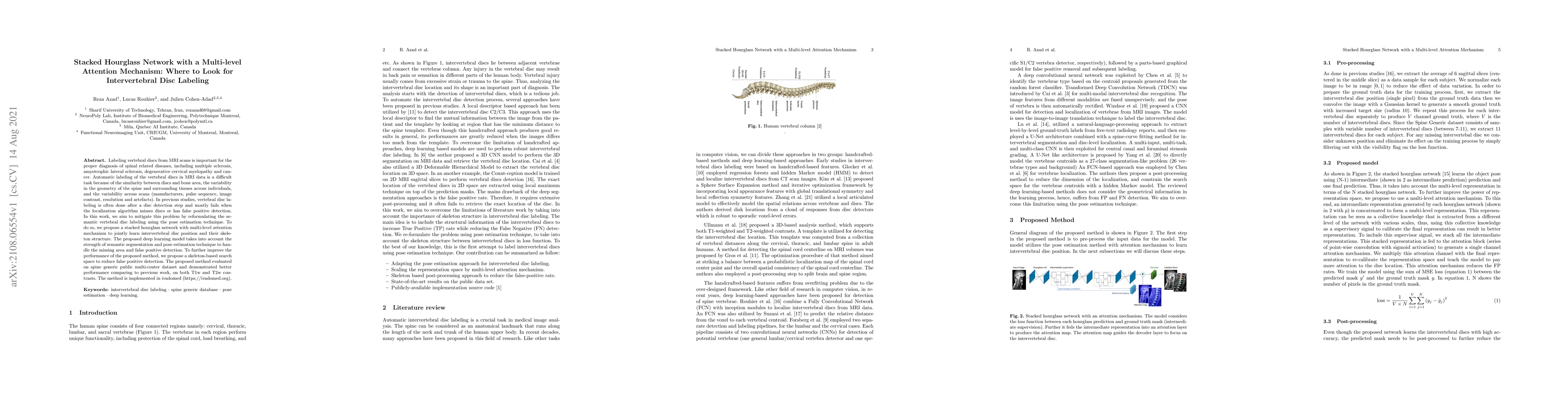 This paper proposes a stacked hourglass network with a multi-level attention mechanism to automatically label intervertebral discs in MRI scans, addressing challenges like disc-bone similarity and variability in spine geometry. The method integrates pose estimation and a skeleton-based search space to improve accuracy and reduce false positives, outperforming previous techniques on a multi-center dataset.