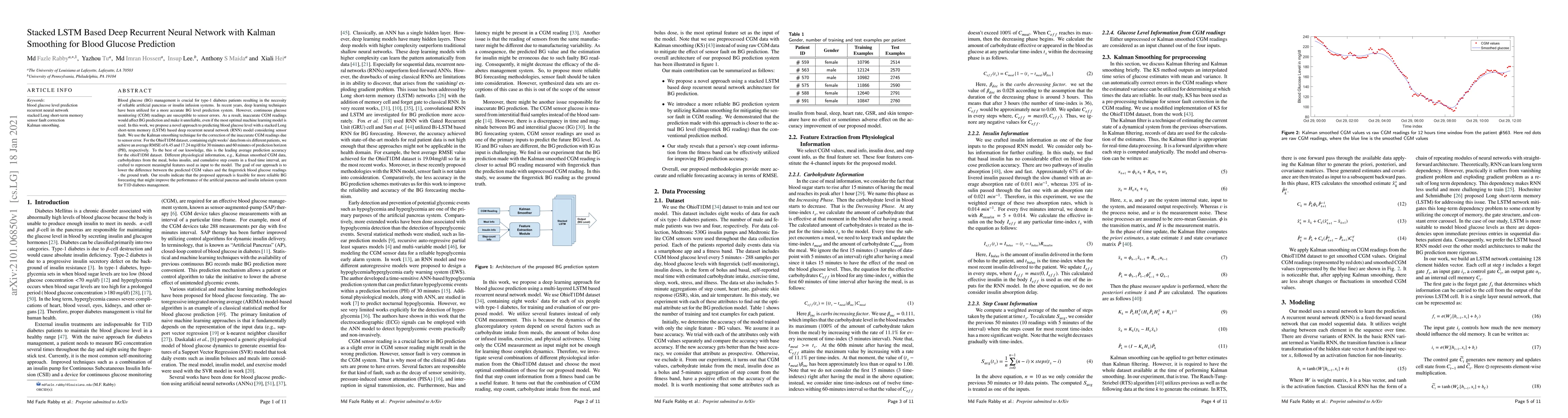 This paper proposes a stacked LSTM-based deep RNN model with Kalman smoothing to predict blood glucose levels for type-1 diabetes patients, addressing sensor errors in CGM readings. The approach achieves an average RMSE of 6.45 and 17.24 mg/dl for 30-minute and 60-minute predictions, respectively, demonstrating improved accuracy over the OhioT1DM dataset.