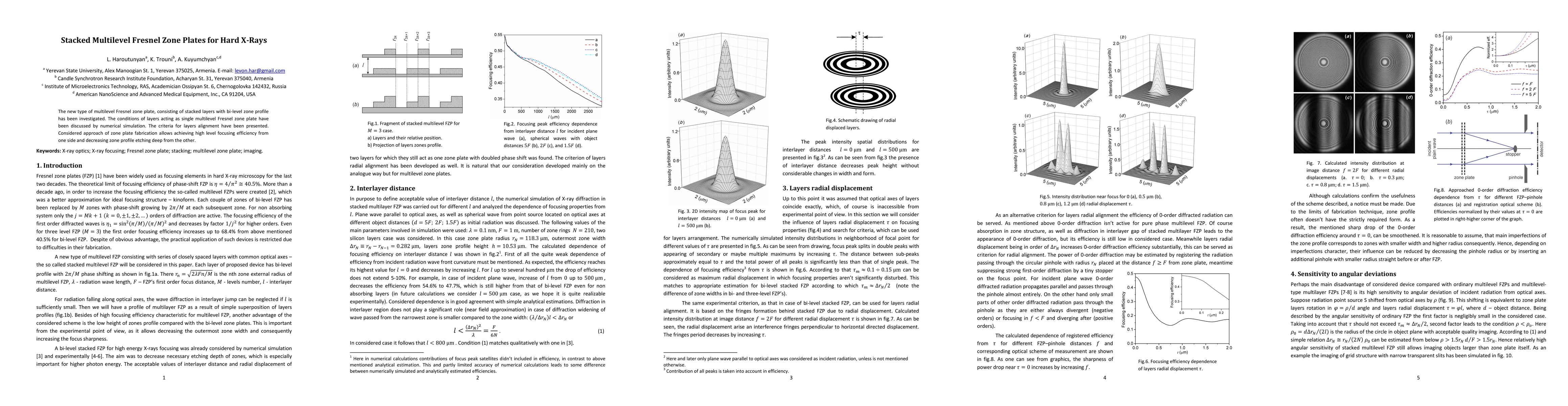 This paper investigates stacked multilevel Fresnel zone plates for hard X-rays, demonstrating high focusing efficiency through numerical simulations. The study presents criteria for optimal layer alignment, achieving effective focusing while minimizing etching depth.