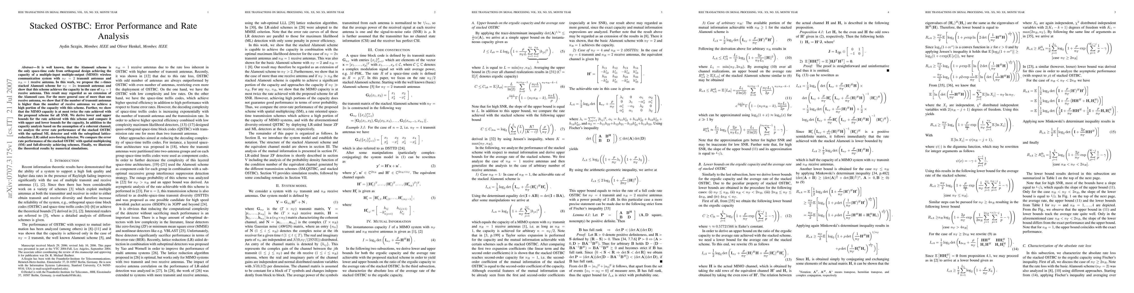 This paper proposes an n-times stacked Alamouti scheme for MIMO systems with 2n transmit antennas and 1 receive antenna, demonstrating its capacity-achieving performance. The study also extends this analysis to scenarios with multiple receive antennas, providing rate bounds and comparing error rates with optimal and suboptimal detectors, alongside spatial multiplexing schemes.