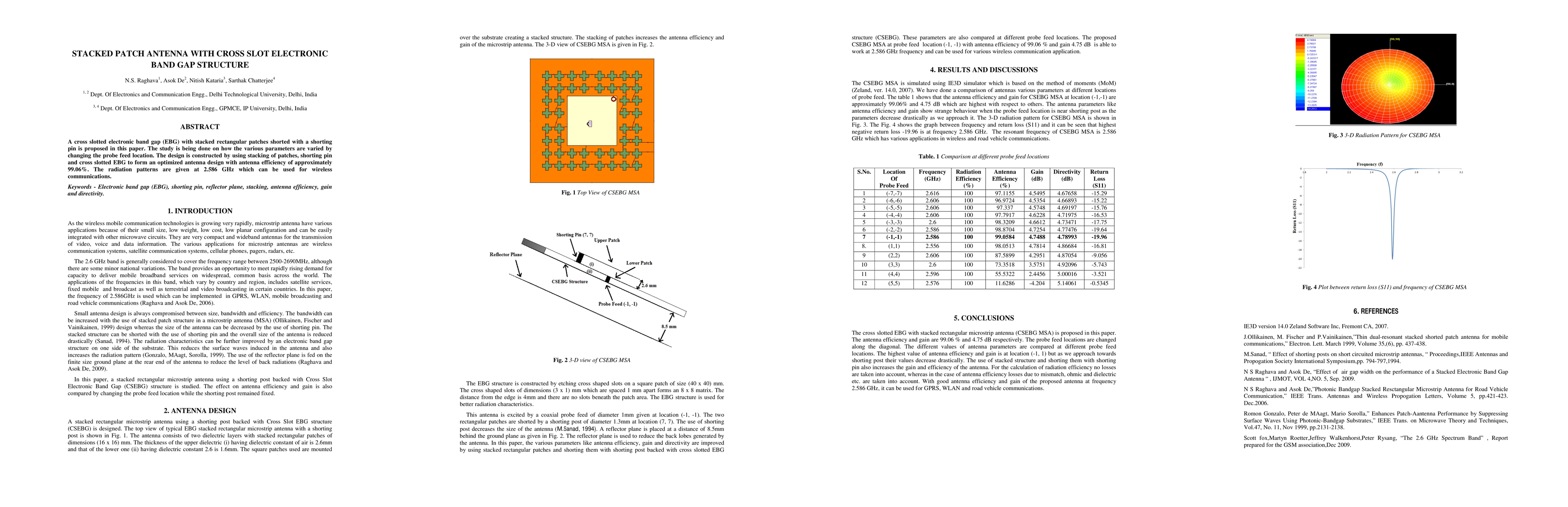 This paper proposes a stacked patch antenna with a cross slotted electronic band gap structure, optimizing antenna efficiency to approximately 99.06%. The study investigates the impact of varying probe feed locations on antenna performance, demonstrating effective radiation patterns at 2.586 GHz for wireless communications.