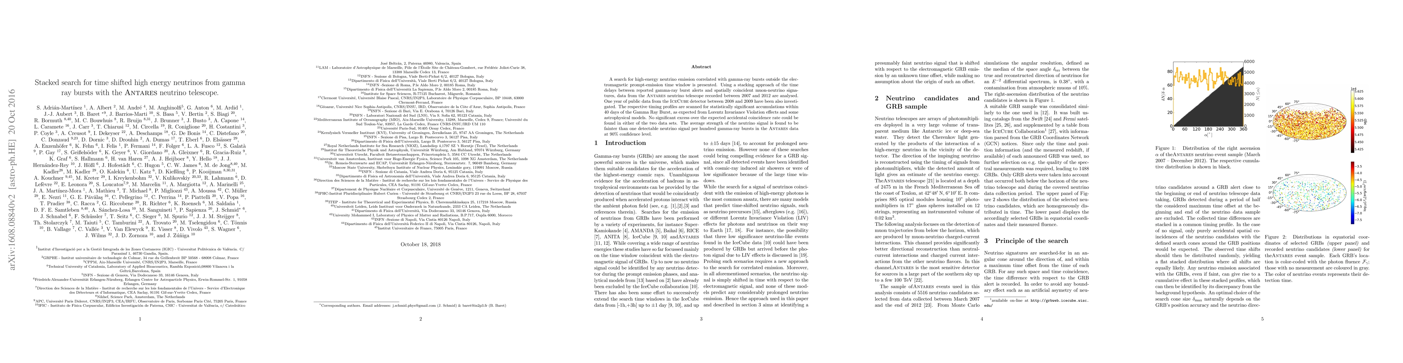 This paper investigates high-energy neutrino emissions from gamma-ray bursts using the ANTARES telescope and a stacking approach for time delays. No significant neutrino signals were detected, indicating that the neutrino emission strength is weaker than one per hundred gamma-ray bursts.