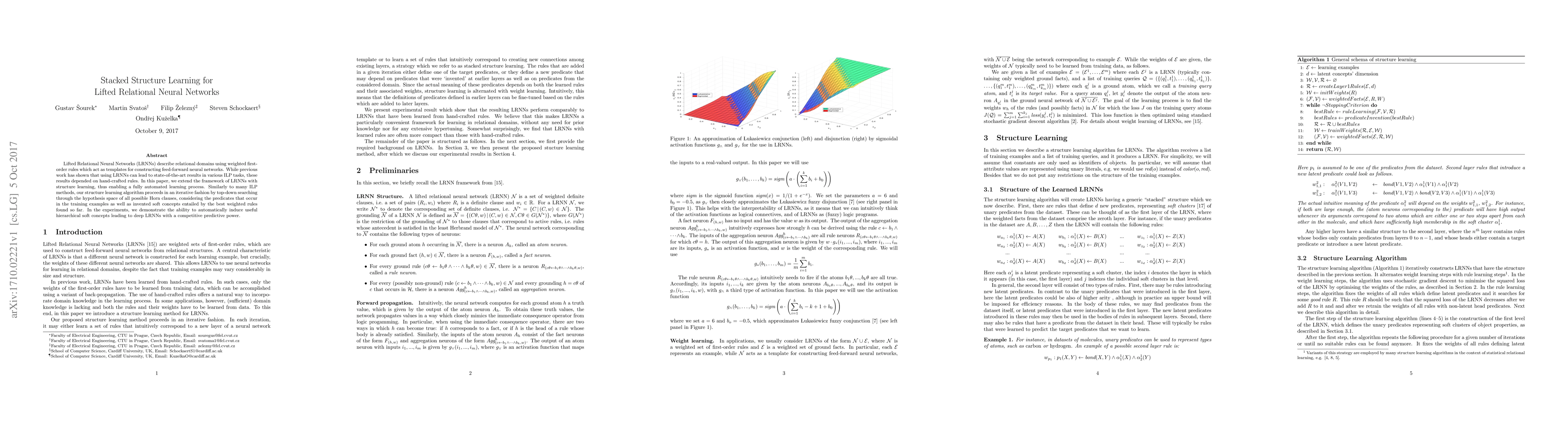 This paper introduces a structure learning approach for Lifted Relational Neural Networks (LRNNs) to automate the learning process, enabling the induction of hierarchical soft concepts. The proposed iterative top-down algorithm searches through possible Horn clauses, leading to deep LRNNs with competitive predictive performance.