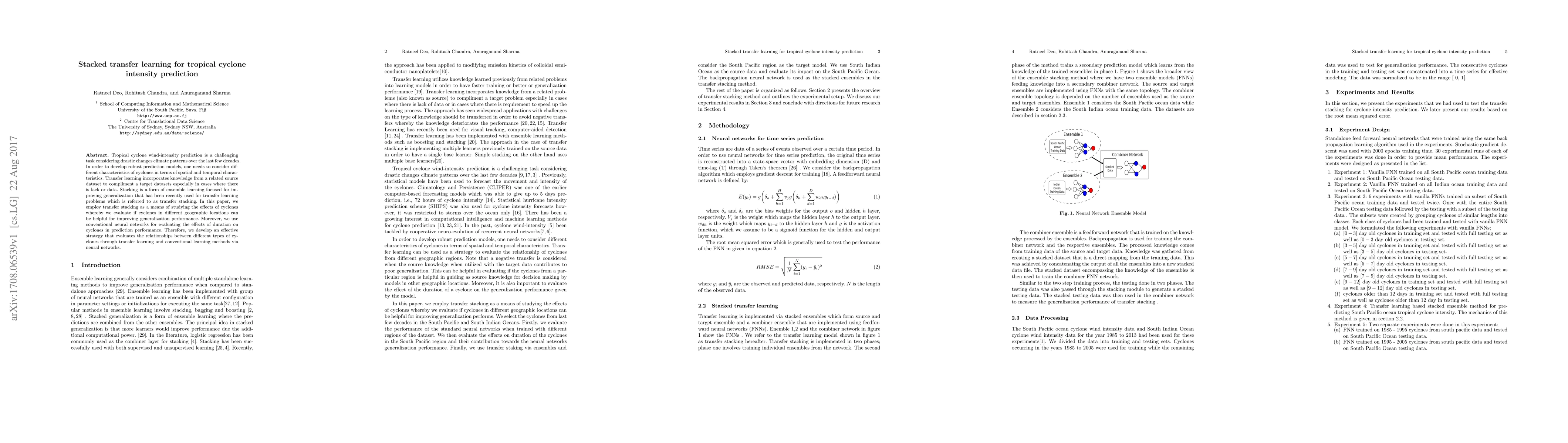 This paper explores the use of stacked transfer learning to enhance tropical cyclone intensity prediction, leveraging knowledge from different geographic locations to improve model robustness. The study combines transfer stacking with conventional neural networks to assess the impact of cyclone duration on prediction performance, aiming to develop a strategy that effectively evaluates relationships between various cyclone types.