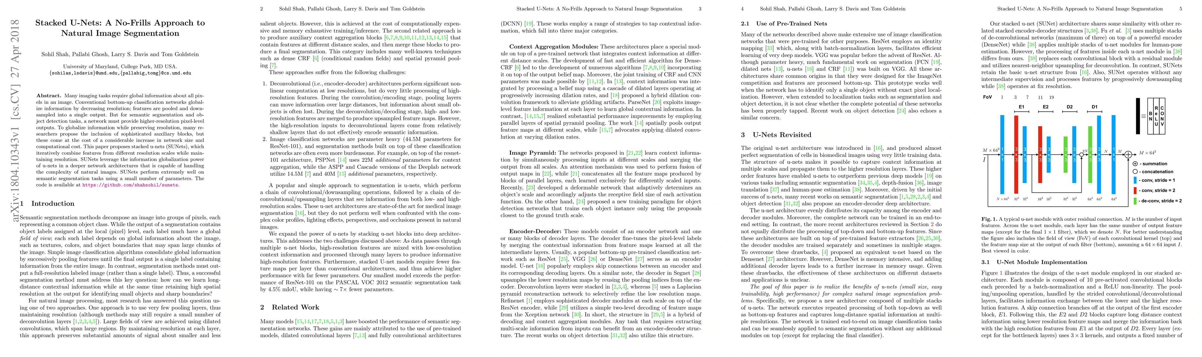 This paper introduces Stacked U-Nets (SUNets) for natural image segmentation, combining features from different resolution scales iteratively without losing resolution. SUNets achieve high performance in semantic segmentation with minimal parameters, avoiding the complexity and cost of traditional methods.