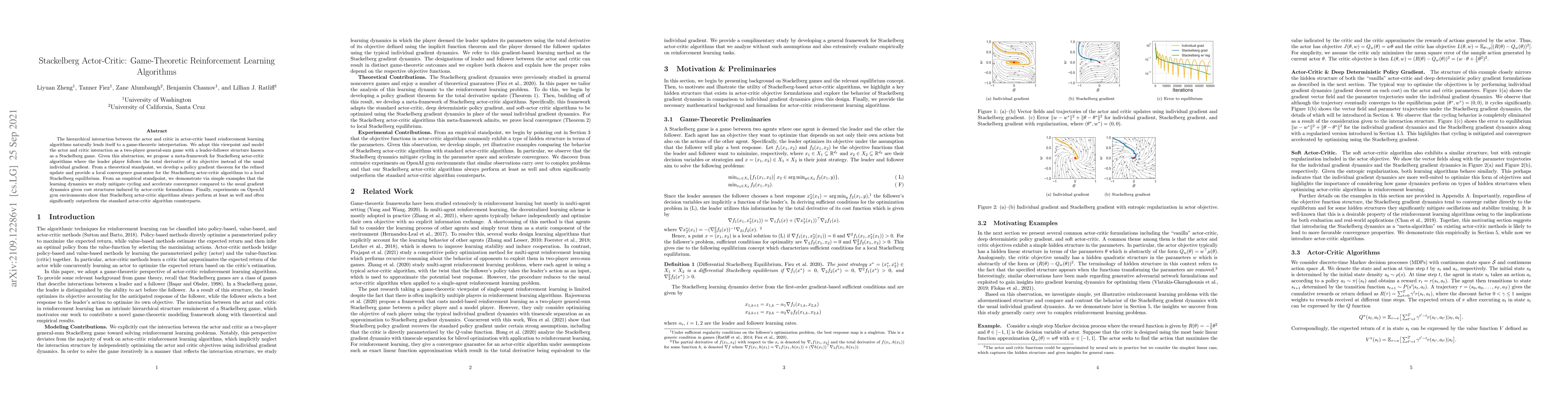 This paper proposes a Stackelberg actor-critic framework for reinforcement learning, where the actor and critic are modeled as a leader-follower game. It demonstrates improved convergence and performance over standard actor-critic algorithms through theoretical analysis and empirical experiments.