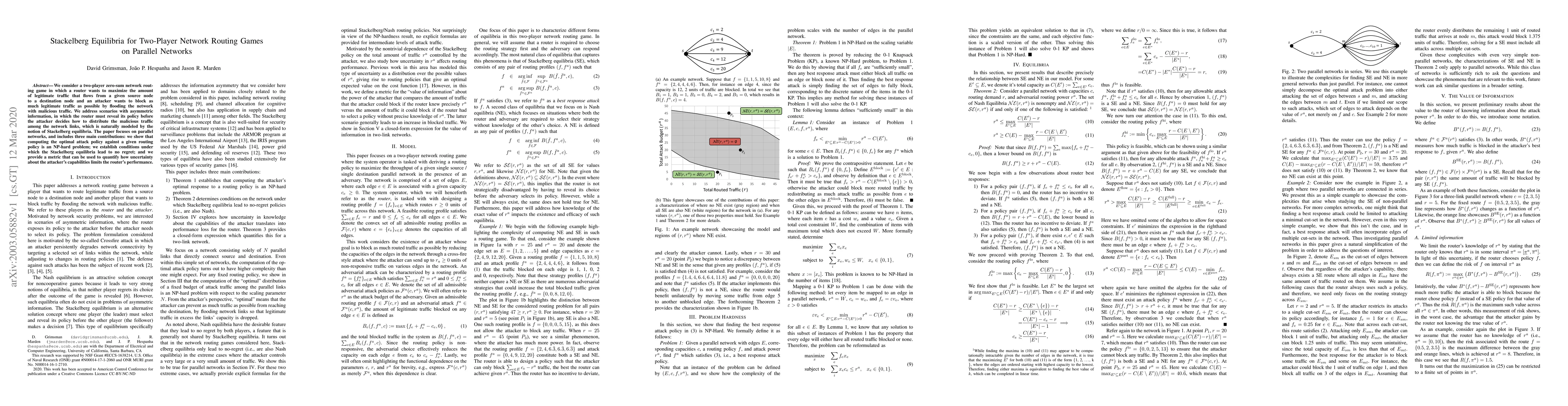 This research investigates a two-player network game where a router aims to maximize legitimate traffic and an attacker tries to disrupt it. Focusing on parallel networks, it proves finding optimal attack strategies is NP-hard, establishes conditions for Stackelberg equilibria with no regret, and introduces a metric to measure router performance under uncertainty about attacker capabilities.