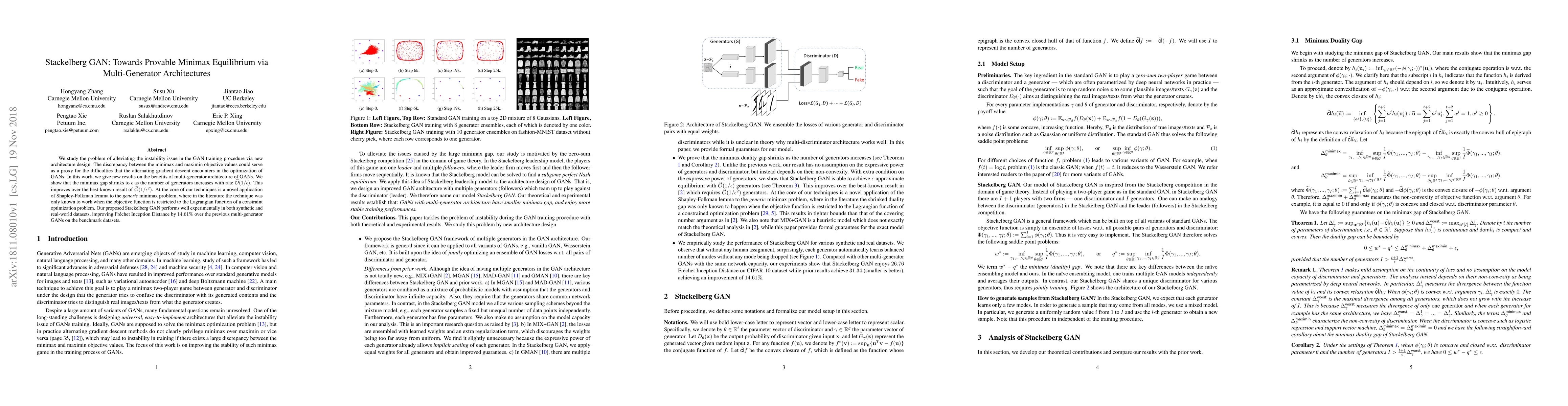 We study the problem of alleviating the instability issue in the GAN training procedure via new architecture design. The discrepancy between the minimax and maximin objective values could serve as a proxy for the difficulties that the alternating gradient descent encounters in the optimization of GANs. In this work, we give new results on the benefits of multi-generator architecture of GANs. We show that the minimax gap shrinks to $\epsilon$ as the number of generators increases with rate $\widetilde{O}(1/\epsilon)$. This improves over the best-known result of $\widetilde{O}(1/\epsilon^2)$. At the core of our techniques is a novel application of Shapley-Folkman lemma to the generic minimax problem, where in the literature the technique was only known to work when the objective function is restricted to the Lagrangian function of a constraint optimization problem. Our proposed Stackelberg GAN performs well experimentally in both synthetic and real-world datasets, improving Fr\'echet Inception Distance by $14.61\%$ over the previous multi-generator GANs on the benchmark datasets.