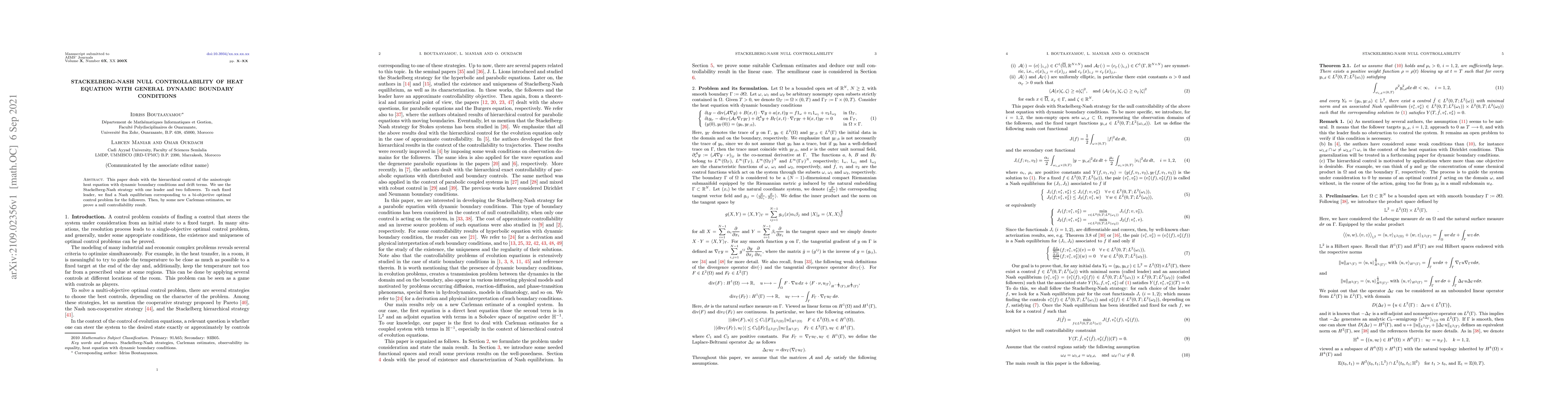 This paper explores the hierarchical control of the anisotropic heat equation with dynamic boundary conditions using a Stackelberg-Nash strategy. It establishes a null controllability result through new Carleman estimates and a bi-objective optimal control problem for followers under a leader-follower framework.