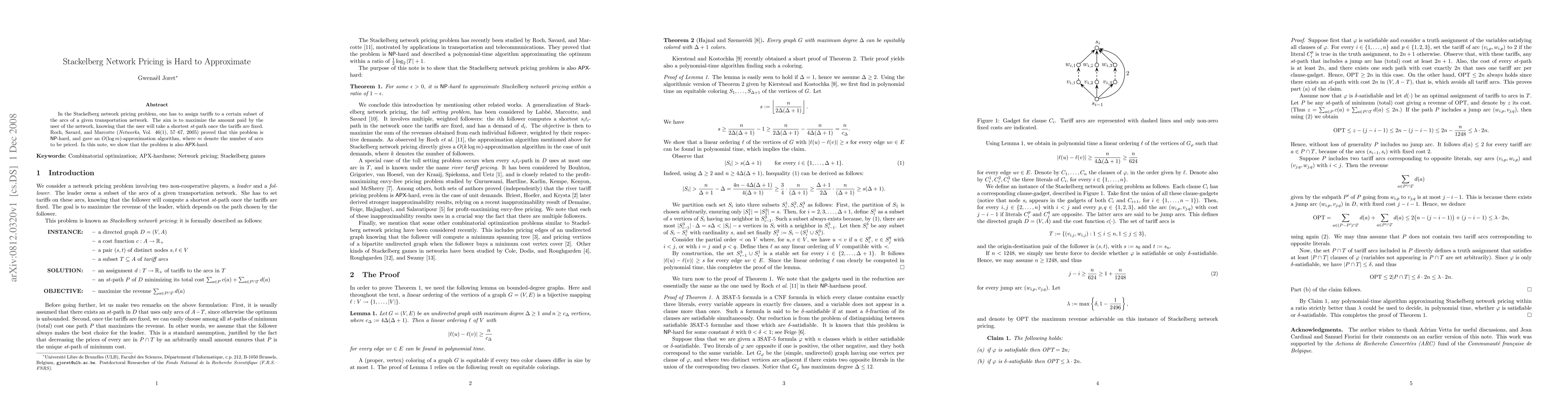 This paper demonstrates that the Stackelberg Network Pricing problem, which involves setting tariffs on a subset of a network's arcs to maximize user payments, is APX-hard, extending previous results that showed it to be NP-hard and providing an O(log m)-approximation algorithm.