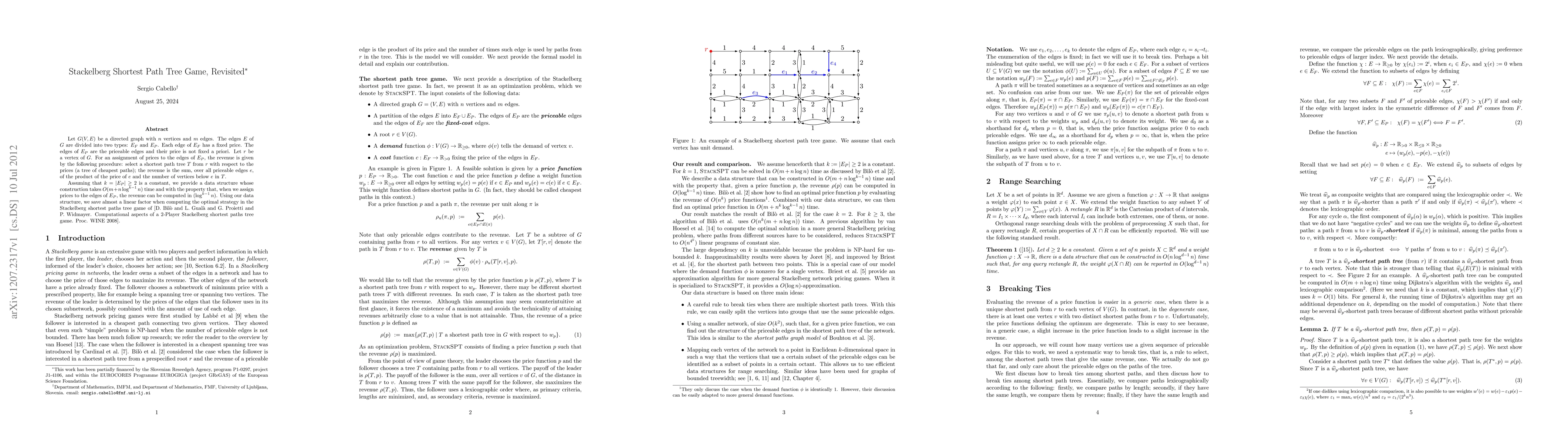 Let $G(V,E)$ be a directed graph with $n$ vertices and $m$ edges. The edges $E$ of $G$ are divided into two types: $E_F$ and $E_P$. Each edge of $E_F$ has a fixed price. The edges of $E_P$ are the priceable edges and their price is not fixed a priori. Let $r$ be a vertex of $G$. For an assignment of prices to the edges of $E_P$, the revenue is given by the following procedure: select a shortest path tree $T$ from $r$ with respect to the prices (a tree of cheapest paths); the revenue is the sum, over all priceable edges $e$, of the product of the price of $e$ and the number of vertices below $e$ in $T$. Assuming that $k=|E_P|\ge 2$ is a constant, we provide a data structure whose construction takes $O(m+n\log^{k-1} n)$ time and with the property that, when we assign prices to the edges of $E_P$, the revenue can be computed in $(\log^{k-1} n)$. Using our data structure, we save almost a linear factor when computing the optimal strategy in the Stackelberg shortest paths tree game of [D. Bil{\`o} and L. Gual{\`a} and G. Proietti and P. Widmayer. Computational aspects of a 2-Player Stackelberg shortest paths tree game. Proc. WINE 2008].