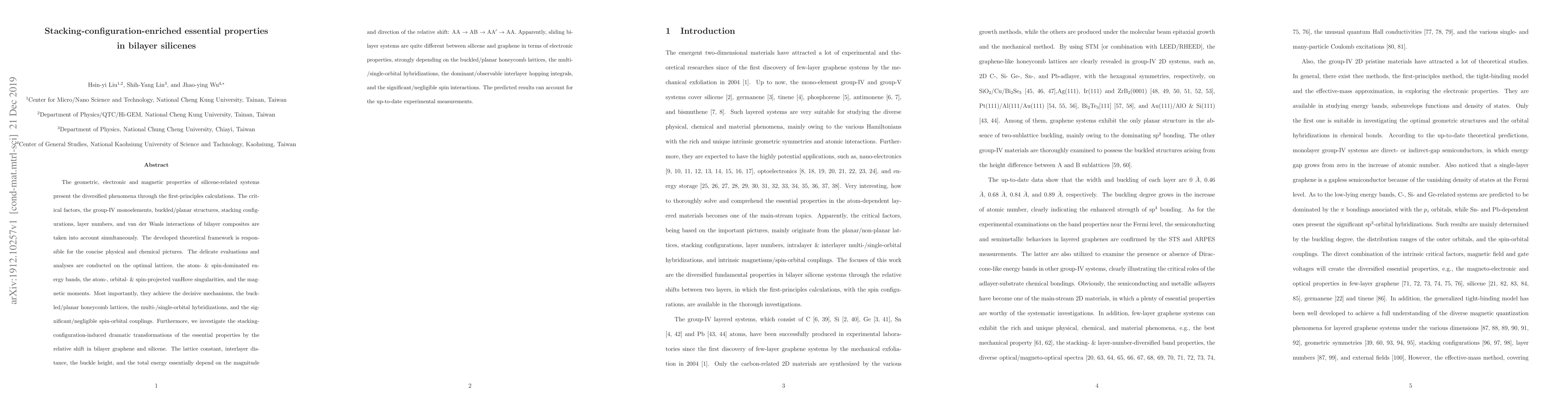 The geometric, electronic and magnetic properties of silicene-related systems present the diversified phenomena through the first-principles calculations. The critical factors, the group-IV monoelements, buckled/planar structures, stacking configurations, layer numbers, and van der Waals interactions of bilayer composites are taken into account simultaneously. The developed theoretical framework is responsible for the concise physical and chemical pictures. The delicate evaluations and analyses are conducted on the optimal lattices, the atom- $\&$ spin-dominated energy bands, the atom-, orbital- $\&$ spin-projected vanHove singularities, and the magnetic moments. Most importantly, they achieve the decisive mechanisms, the buckled/planar honeycomb lattices, the multi-/single-orbital hybridizations, and the significant/negligible spin-orbital couplings. Furthermore, we investigate the stacking-configuration-induced dramatic transformations of the essential properties by the relative shift in bilayer graphene and silicene. The lattice constant, interlayer distance, the buckle height, and the total energy essentially depend on the magnitude and direction of the relative shift: AA $\rightarrow$ AB $\rightarrow$ AA$^{\prime}$ $\rightarrow$ AA. Apparently, sliding bilayer systems are quite different between silicene and graphene in terms of electronic properties, strongly depending on the buckled/planar honeycomb lattices, the multi-/single-orbital hybridizations, the dominant/observable interlayer hopping integrals, and the significant/negligible spin interactions. The predicted results can account for the up-to-date experimental measurements.