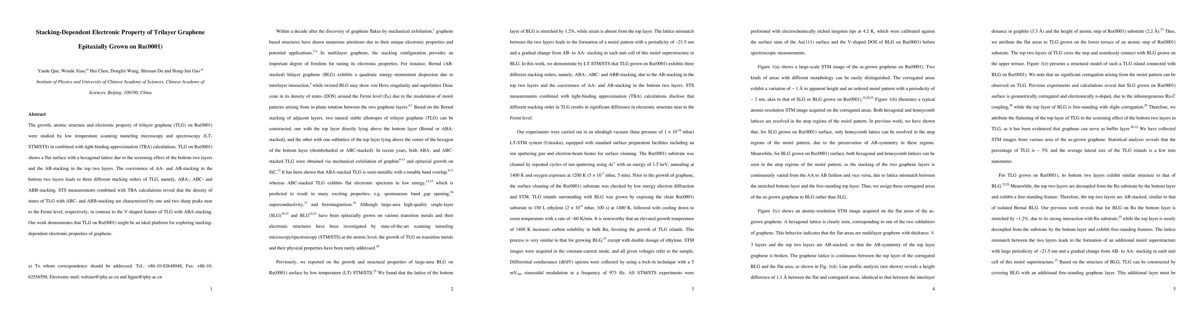 Trilayer graphene (TLG) on Ru(0001) exhibits distinct electronic properties based on its stacking order, with ABC- and ABB-stacking showing sharp peaks near the Fermi level, unlike the ABA-stacking's V-shaped feature. This study highlights TLG on Ru(0001) as a promising platform for investigating stacking-dependent electronic behaviors in graphene.