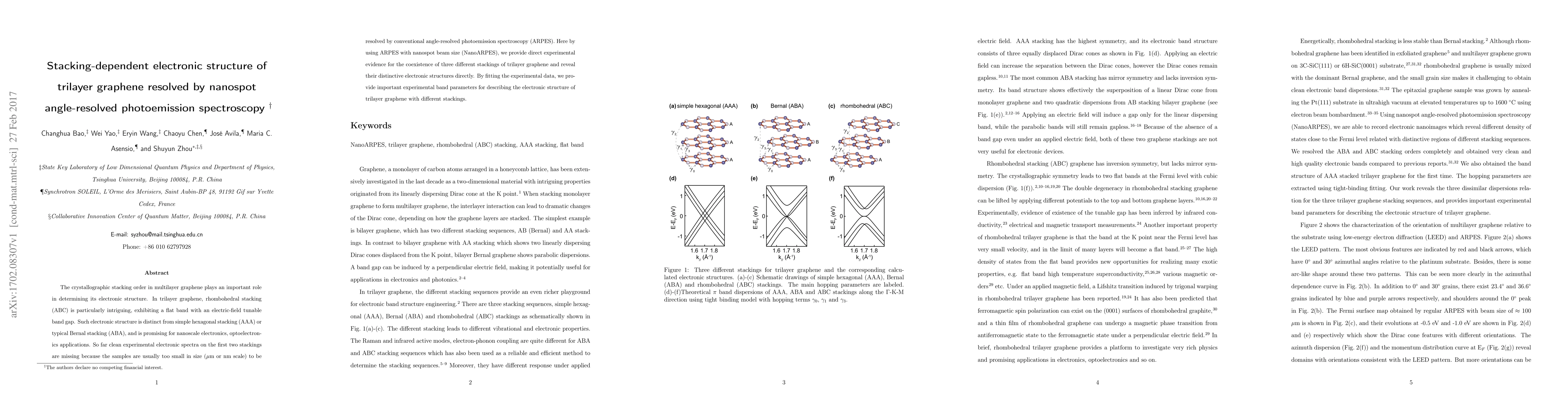 This study uses nanospot angle-resolved photoemission spectroscopy (NanoARPES) to reveal the distinct electronic structures of trilayer graphene with different crystallographic stackings, including rhombohedral (ABC), hexagonal (AAA), and Bernal (ABA) configurations, providing crucial experimental band parameters for their characterization.
