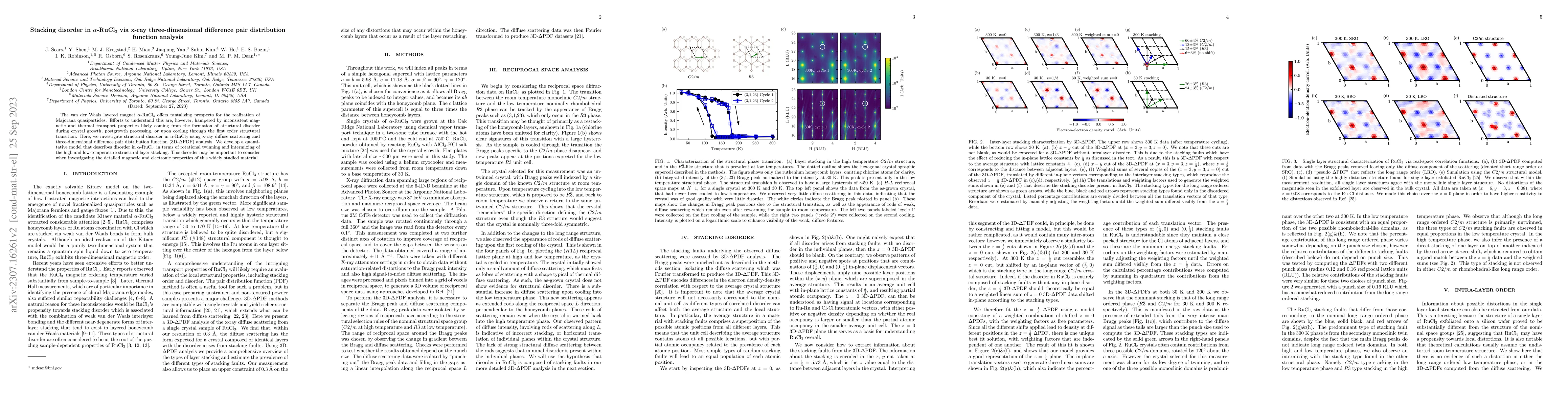 The van der Waals layered magnet $\alpha$-RuCl$_3$ offers tantalizing prospects for the realization of Majorana quasiparticles. Efforts to understand this are, however, hampered by inconsistent magnetic and thermal transport properties likely coming from the formation of structural disorder during crystal growth, postgrowth processing, or upon cooling through the first order structural transition. Here, we investigate structural disorder in $\alpha$-RuCl$_3$ using x-ray diffuse scattering and three-dimensional difference pair distribution function (3D-$\Delta$PDF) analysis. We develop a quantitative model that describes disorder in $\alpha$-RuCl$_3$ in terms of rotational twinning and intermixing of the high and low-temperature structural layer stacking. This disorder may be important to consider when investigating the detailed magnetic and electronic properties of this widely studied material.