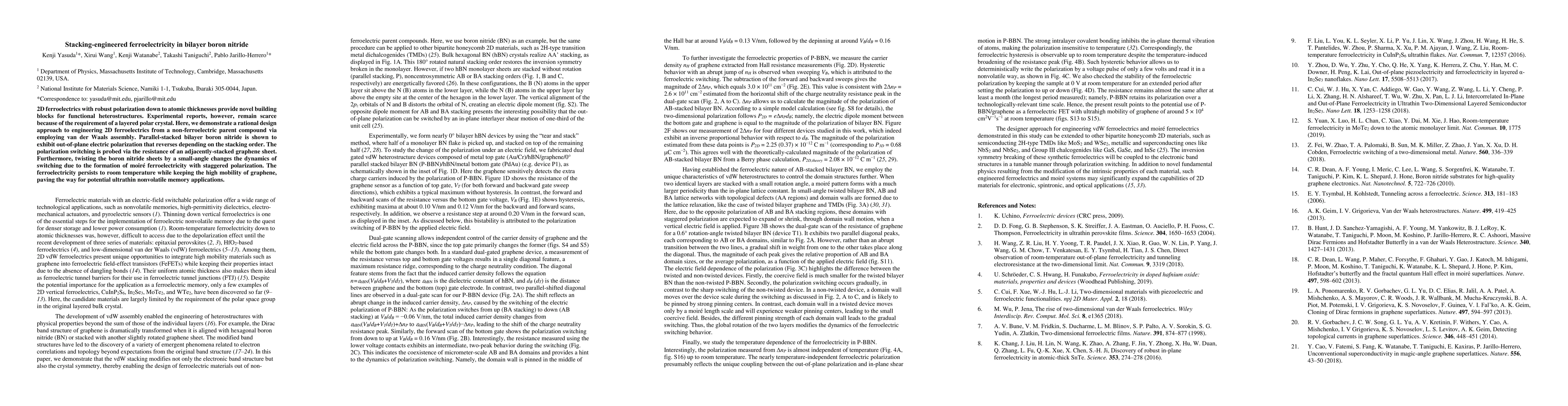 This paper demonstrates a method to engineer ferroelectricity in bilayer boron nitride through van der Waals assembly, showing out-of-plane polarization that reverses with stacking order and persists at room temperature, potentially enabling ultrathin nonvolatile memory devices. Twisting the boron nitride layers introduces moiré ferroelectricity, altering switching dynamics.