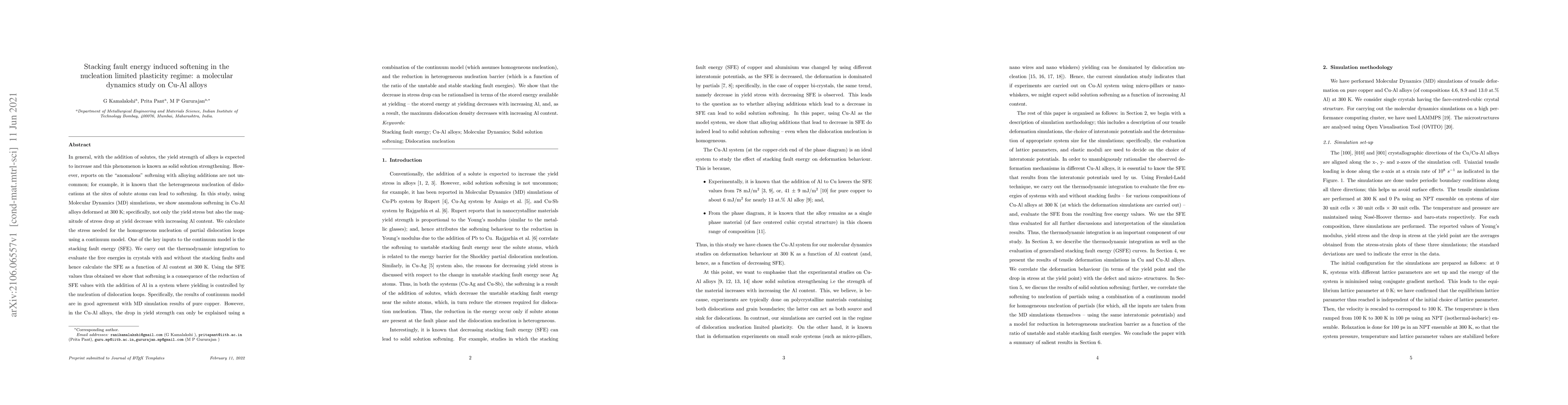 This study uses Molecular Dynamics simulations to demonstrate anomalous softening in Cu-Al alloys, showing decreased yield stress and stress drop with increasing Al content. The reduction in stacking fault energy (SFE) due to Al addition explains the softening in the nucleation-limited plasticity regime, where dislocation loop nucleation controls yielding.