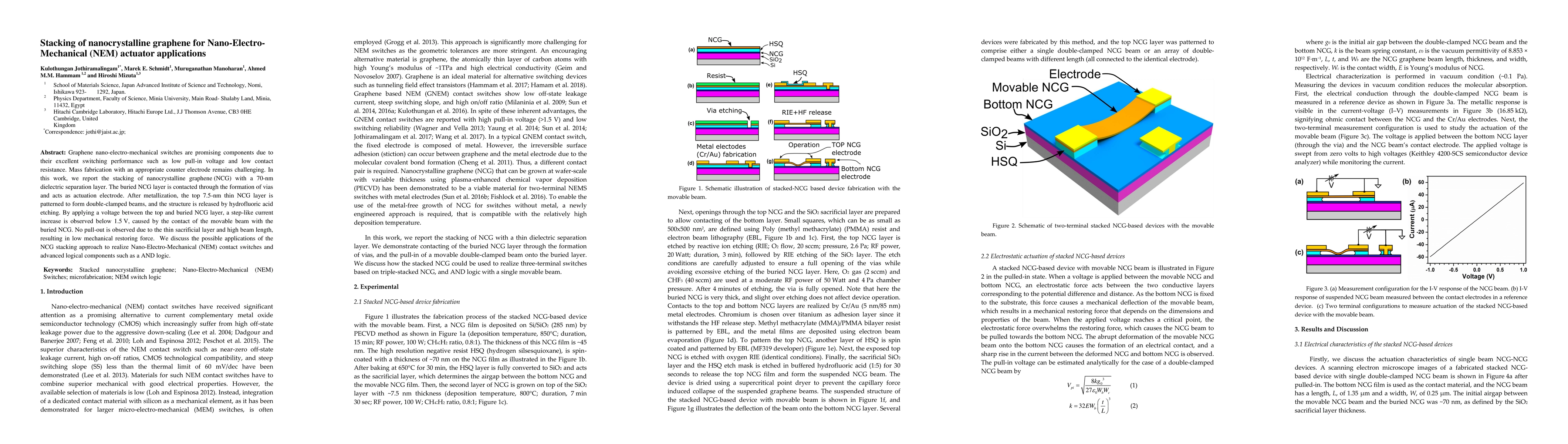 This paper presents a method for stacking nanocrystalline graphene (NCG) layers with a dielectric separation for NEM actuator applications, achieving low pull-in voltage and demonstrating potential for NEM switches and logical components. The structure shows a step-like current increase below 1.5 V due to beam contact with the buried NCG layer, with no pull-out observed.