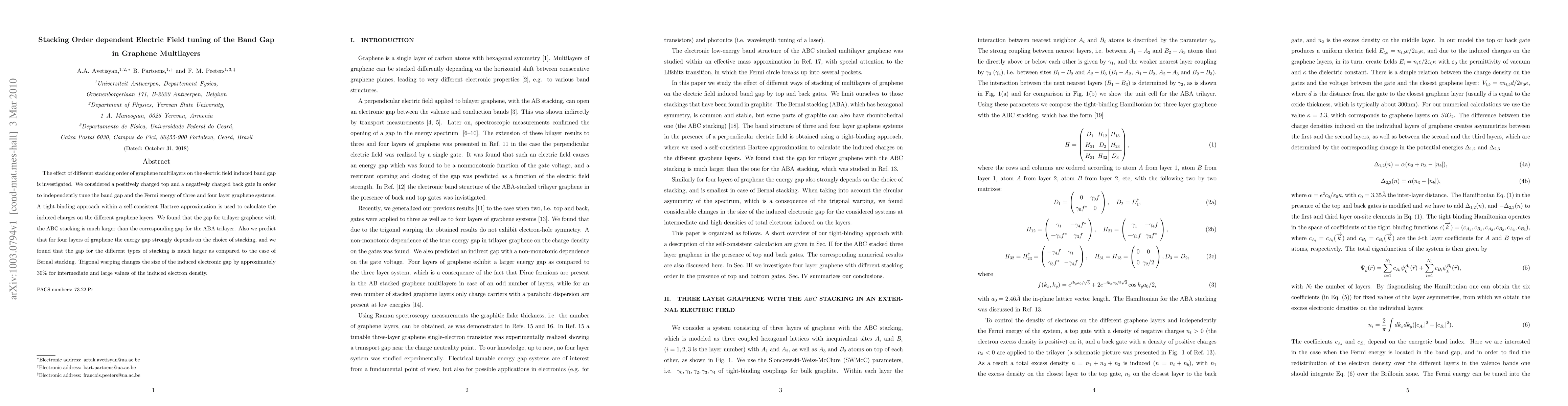 This study investigates how different stacking orders in graphene multilayers affect the electric field-induced band gap, revealing that the ABC stacking in trilayer graphene results in a significantly larger band gap compared to ABA stacking. For four-layer graphene, the energy gap varies greatly depending on the stacking order, with certain configurations showing much larger gaps than the Bernal stacking.