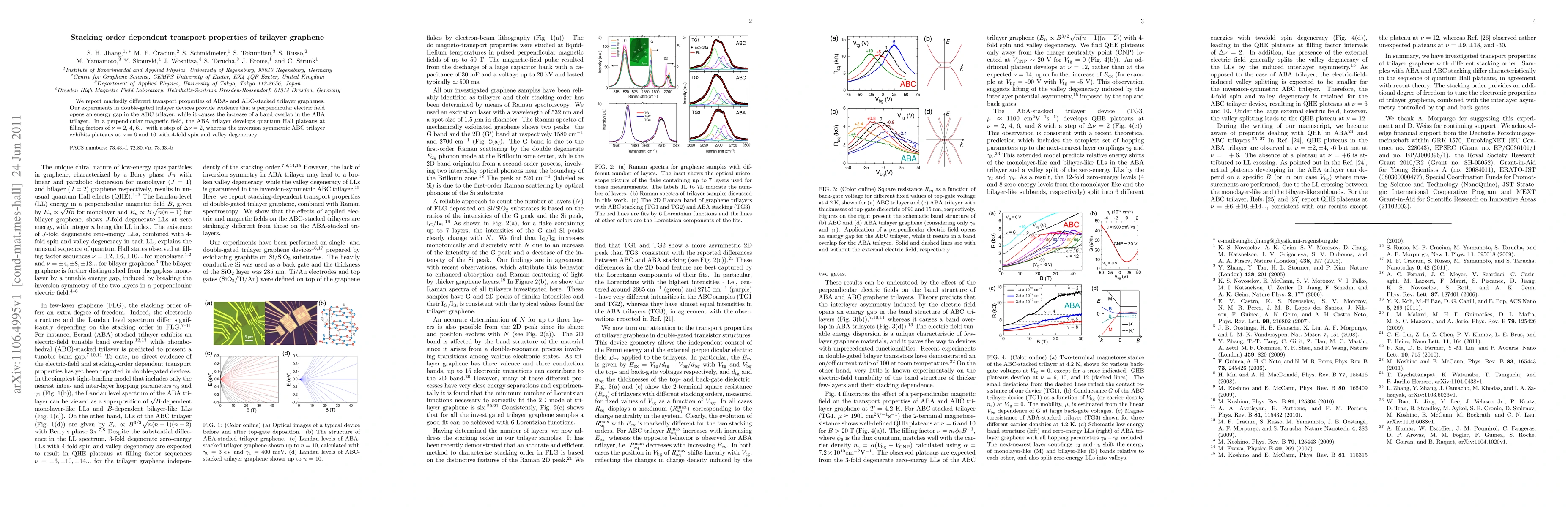 This paper investigates the transport properties of ABA- and ABC-stacked trilayer graphene, revealing that ABC stacking opens an energy gap under a perpendicular electric field, while ABA stacking increases band overlap. In a magnetic field, ABA trilayer shows quantum Hall plateaus at odd multiples of 2, whereas ABC trilayer exhibits plateaus at even multiples of 6 with spin and valley degeneracy.