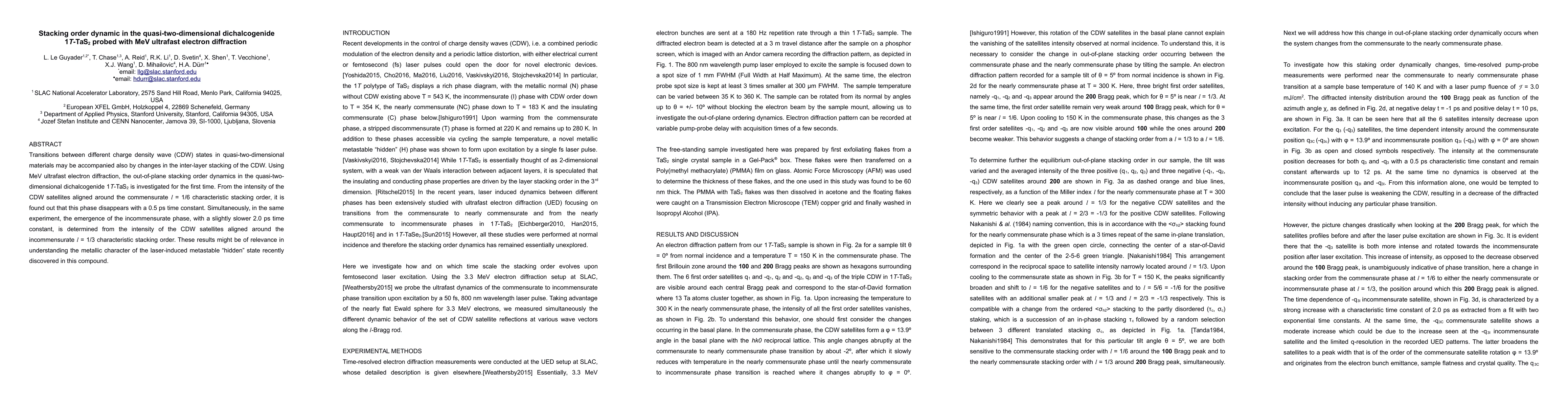 Researchers used MeV ultrafast electron diffraction to study changes in 1T-TaS$_2$ material's stacking order during transitions between different charge density wave states. The results show the disappearance of a specific phase with a time constant of 0.5 ps and the emergence of an incommensurate phase with a slightly slower time constant.