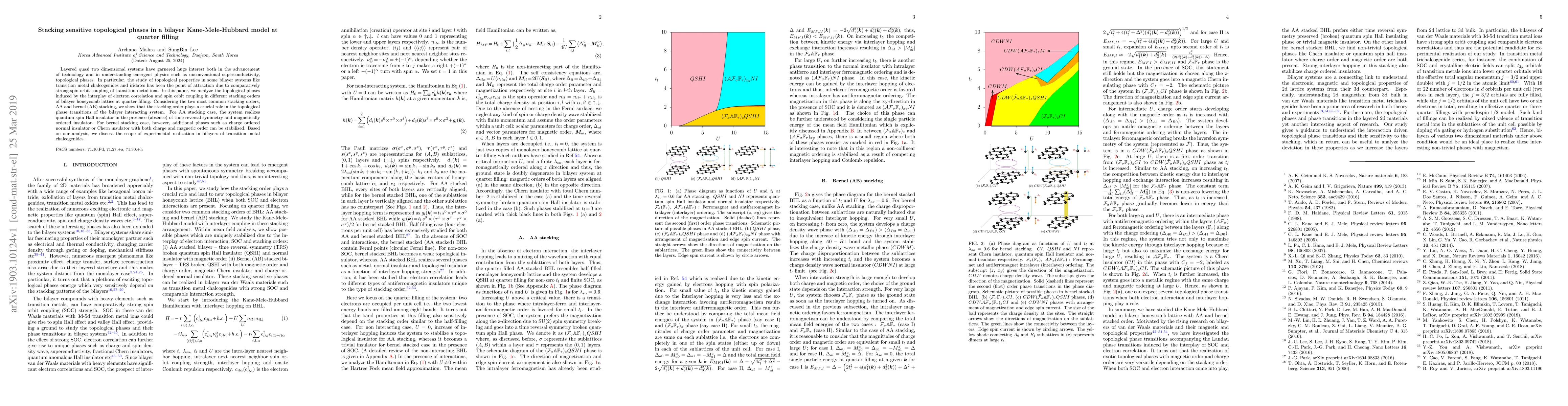 Layered quasi two dimensional systems have garnered huge interest both in the advancement of technology and in understanding emergent physics such as unconventional superconductivity, topological phases. In particular, the study of topological properties in some bilayer systems like transition metal chalcogenides and iridates has been the point of attraction due to comparatively strong spin orbit coupling of transition metal ions. In this paper, we analyze the topological phases induced by the interplay of electron correlation and spin orbit coupling in different stacking orders of bilayer honeycomb lattice at quarter filling. Considering the two most common stacking orders, AA and bernel (AB) stacking, we show that the stacking order plays a crucial role in the topological phase transitions of the bilayer interacting system. For AA stacking case, the system realizes quantum spin Hall insulator in the presence (absence) of time reversal symmetry and magnetically ordered insulator. For bernel stacking case, however, additional phases such as charge ordered normal insulator or Chern insulator with both charge and magnetic order can be stabilized. Based on our analysis, we discuss the scope of experimental realization in bilayers of transition metal chalcogenides.