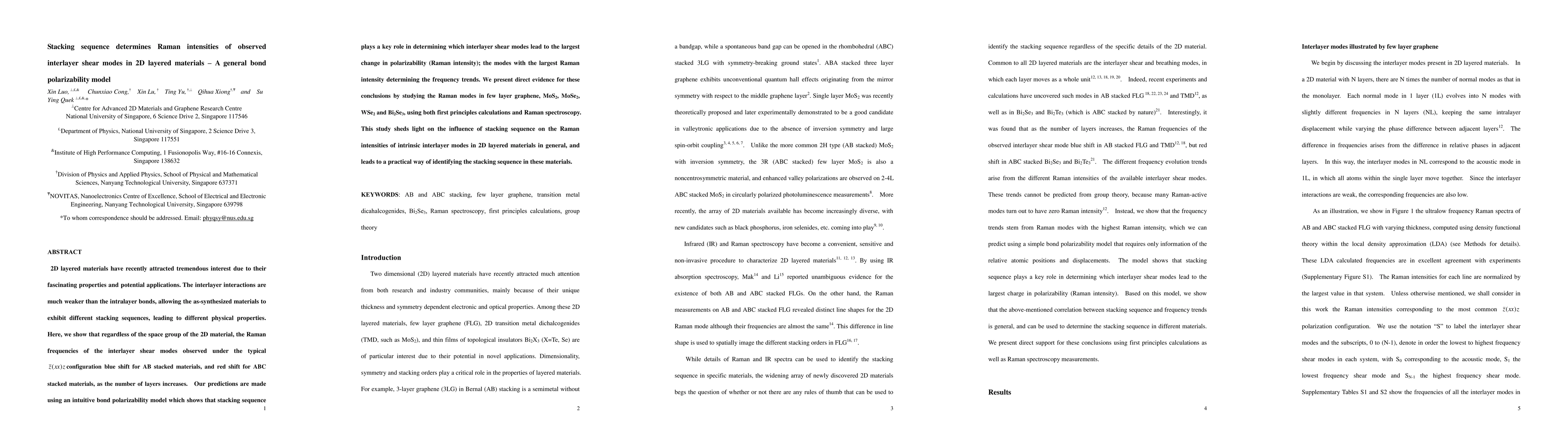 This paper demonstrates that the Raman intensities of interlayer shear modes in 2D layered materials are significantly influenced by their stacking sequence (ABAB vs. ABCABC), with AB stacking causing blue shifts and ABC stacking causing red shifts in Raman frequencies as layer number increases. The findings are supported by a bond polarizability model and validated through Raman spectroscopy and first-principles calculations on materials like graphene, MoS2, MoSe2, WSe2, and Bi2Se3.