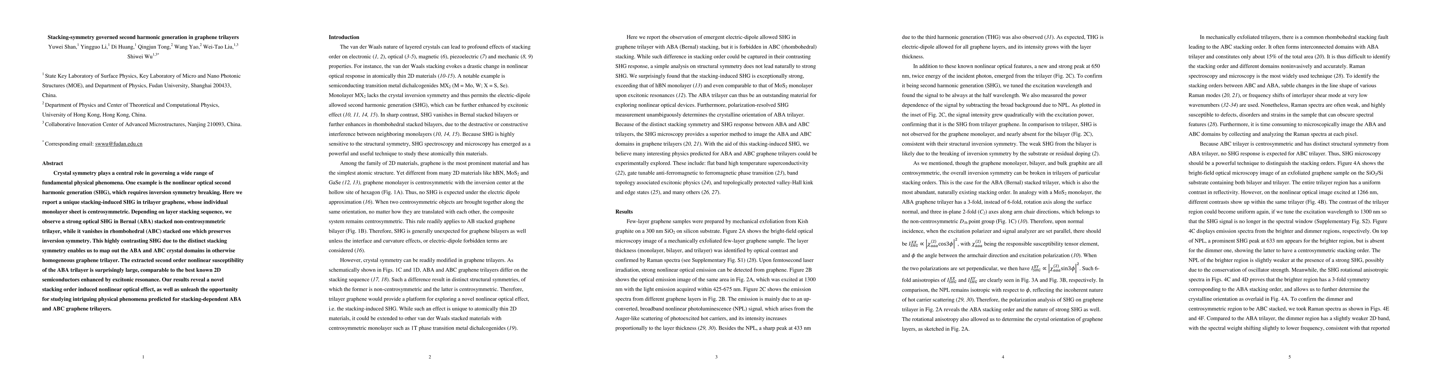 This study reveals a unique second harmonic generation (SHG) in trilayer graphene based on its stacking symmetry, showing strong SHG in non-centrosymmetric ABA stacked trilayers while none in centrosymmetric ABC stacked ones. This discovery opens new avenues for exploring stacking-dependent physical phenomena in graphene.