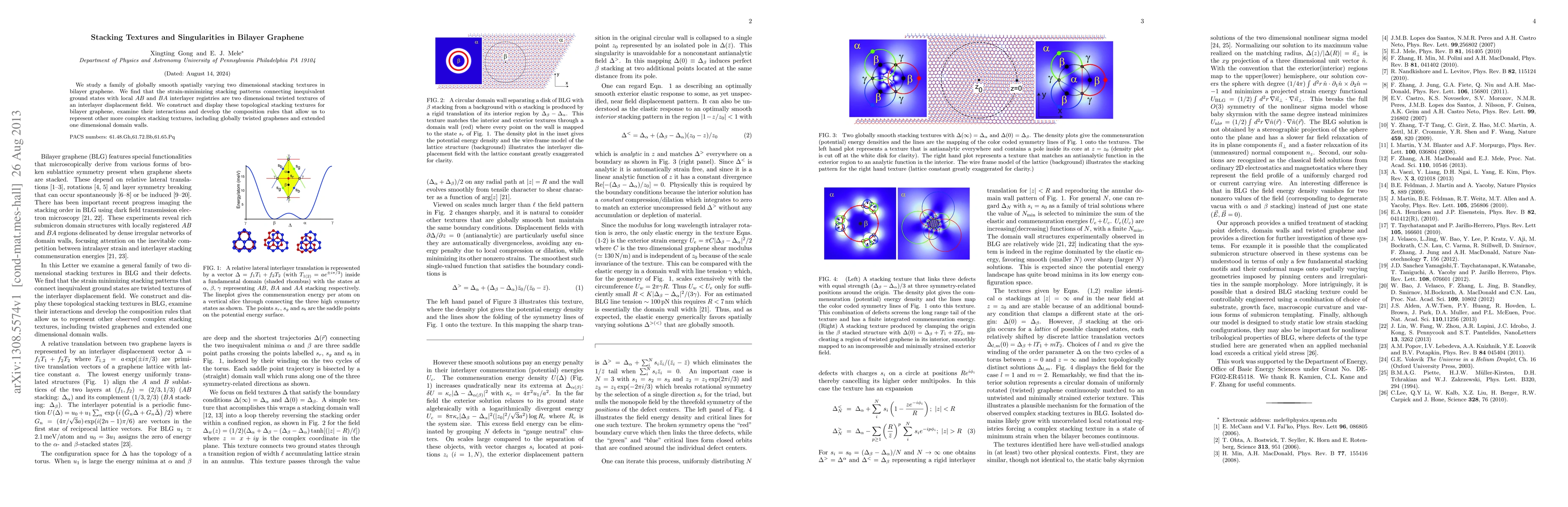 The paper presents a detailed theoretical framework for understanding and constructing topological stacking textures in bilayer graphene, including globally twisted graphenes and domain walls.