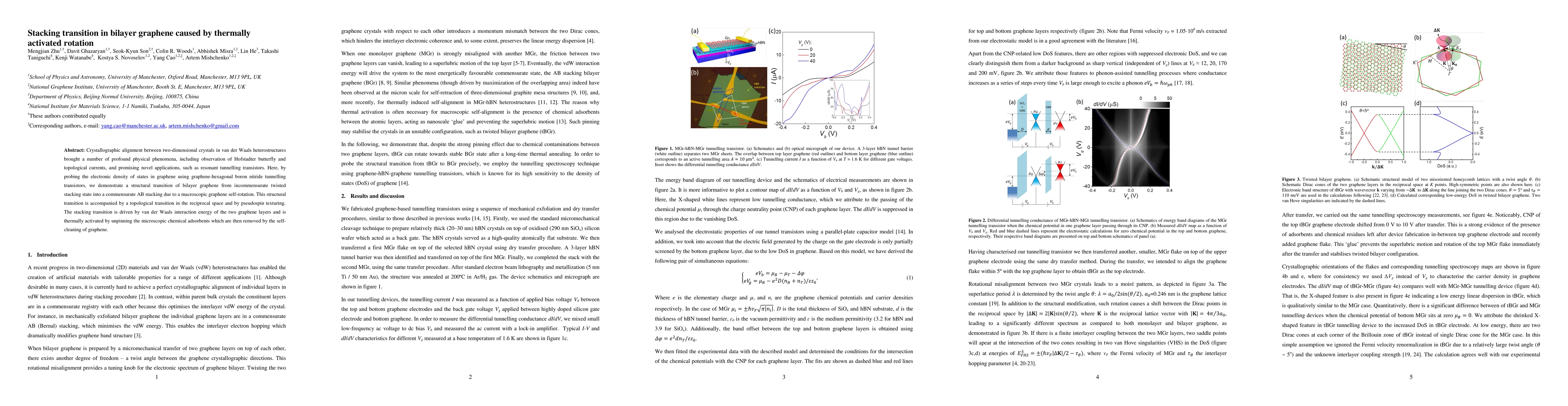 The paper demonstrates a thermally activated structural transition in bilayer graphene from an incommensurate twisted stacking to a commensurate AB stacking due to macroscopic self-rotation, driven by van der Waals forces and facilitated by the removal of microscopic chemical adsorbents. This transition results in a topological change in reciprocal space and pseudospin texturing.