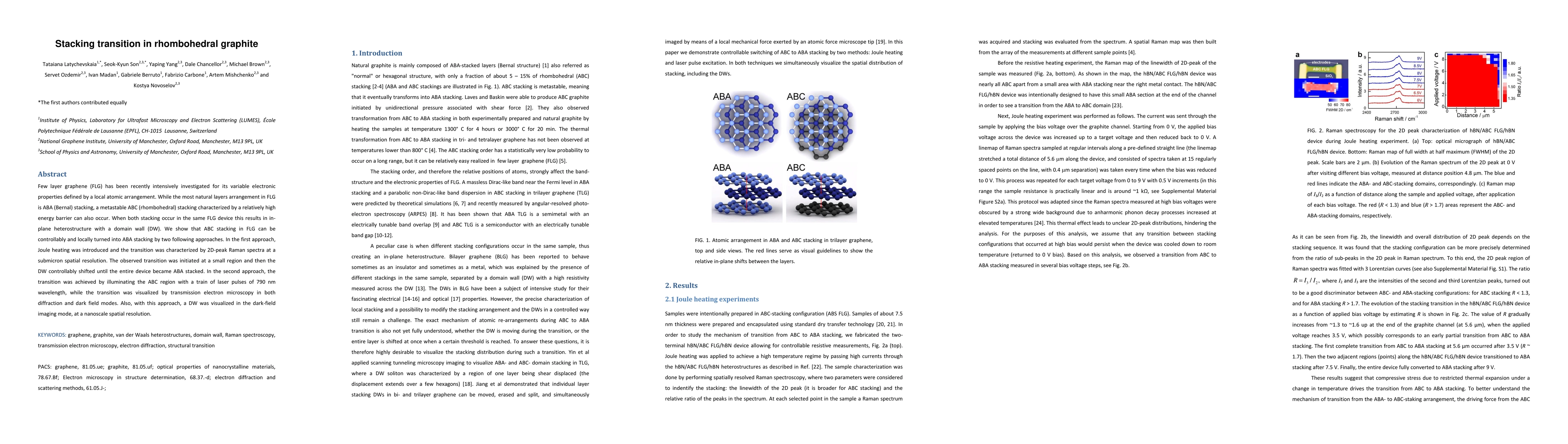 This paper investigates the controllable transition between ABC (rhombohedral) and ABA (Bernal) stacking in few-layer graphene, demonstrating two methods: Joule heating and laser pulse illumination, both of which enable the transformation and visualization of domain wall shifts at submicron and nanoscale resolutions.