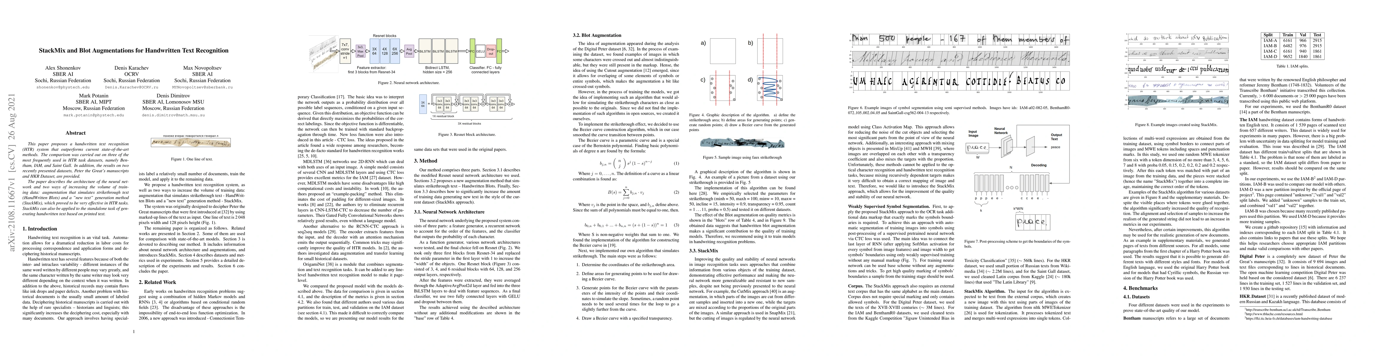 This paper proposes a handwritten text recognition(HTR) system that outperforms current state-of-the-artmethods. The comparison was carried out on three of themost frequently used in HTR task datasets, namely Ben-tham, IAM, and Saint Gall. In addition, the results on tworecently presented datasets, Peter the Greats manuscriptsand HKR Dataset, are provided.The paper describes the architecture of the neural net-work and two ways of increasing the volume of train-ing data: augmentation that simulates strikethrough text(HandWritten Blots) and a new text generation method(StackMix), which proved to be very effective in HTR tasks.StackMix can also be applied to the standalone task of gen-erating handwritten text based on printed text.