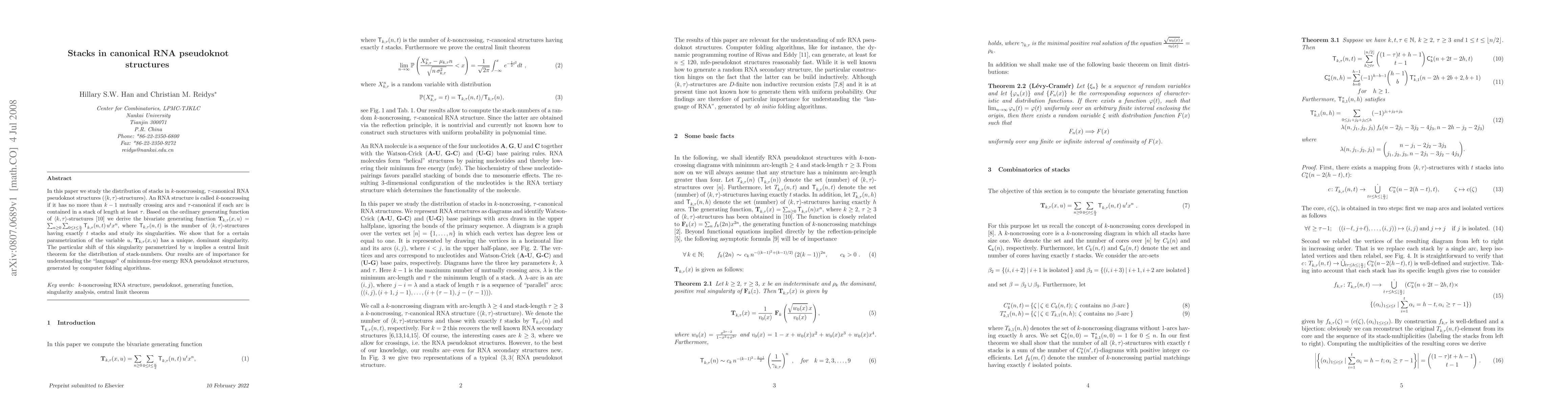 This paper investigates the distribution of stacks in $k$-noncrossing, $\tau$-canonical RNA pseudoknot structures, deriving a bivariate generating function and analyzing its singularities. It demonstrates a unique dominant singularity that implies a central limit theorem for stack-number distribution, aiding in understanding the structural language of RNA pseudoknots.