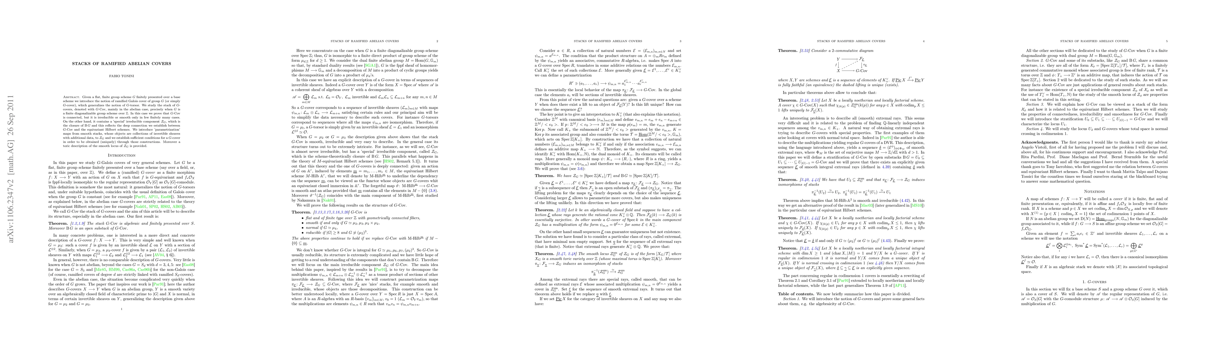 Given a flat, finite group scheme G finitely presented over a base scheme we introduce the notion of ramified Galois cover of group G (or simply G-cover), which generalizes the notion of G-torsor. We study the stack of G-covers, denoted with G-Cov, mainly in the abelian case, precisely when G is a finite diagonalizable group scheme over Z. In this case we prove that G-Cov is connected, but it is irreducible or smooth only in few finitely many cases. On the other hand, it contains a 'special' irreducible component Z_G, which is the closure of BG and this reflects the deep connection we establish between G-Cov and the equivariant Hilbert schemes. We introduce 'parametrization' maps from smooth stacks, whose objects are collections of invertible sheaves with additional data, to Z_G and we establish sufficient conditions for a G-cover in order to be obtained (uniquely) through those constructions. Moreover a toric description of the smooth locus of Z_G is provided.