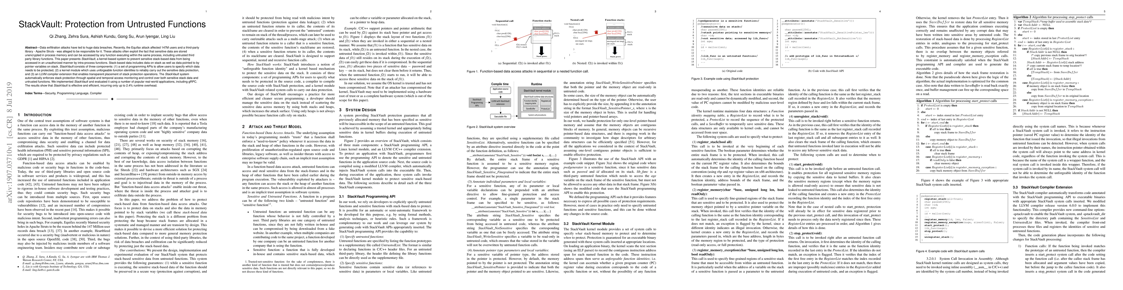 Data exfiltration attacks have led to huge data breaches. Recently, the Equifax attack affected 147M users and a third-party library - Apache Struts - was alleged to be responsible for it. These attacks often exploit the fact that sensitive data are stored unencrypted in process memory and can be accessed by any function executing within the same process, including untrusted third-party library functions. This paper presents StackVault, a kernel-based system to prevent sensitive stack-based data from being accessed in an unauthorized manner by intra-process functions. Stack-based data includes data on stack as well as data pointed to by pointer variables on stack. StackVault consists of three components: (1) a set of programming APIs to allow users to specify which data needs to be protected, (2) a kernel module which uses unforgeable function identities to reliably carry out the sensitive data protection, and (3) an LLVM compiler extension that enables transparent placement of stack protection operations. The StackVault system automatically enforces stack protection through spatial and temporal access monitoring and control over both sensitive stack data and untrusted functions. We implemented StackVault and evaluated it using a number of popular real-world applications, including gRPC. The results show that StackVault is effective and efficient, incurring only up to 2.4% runtime overhead.