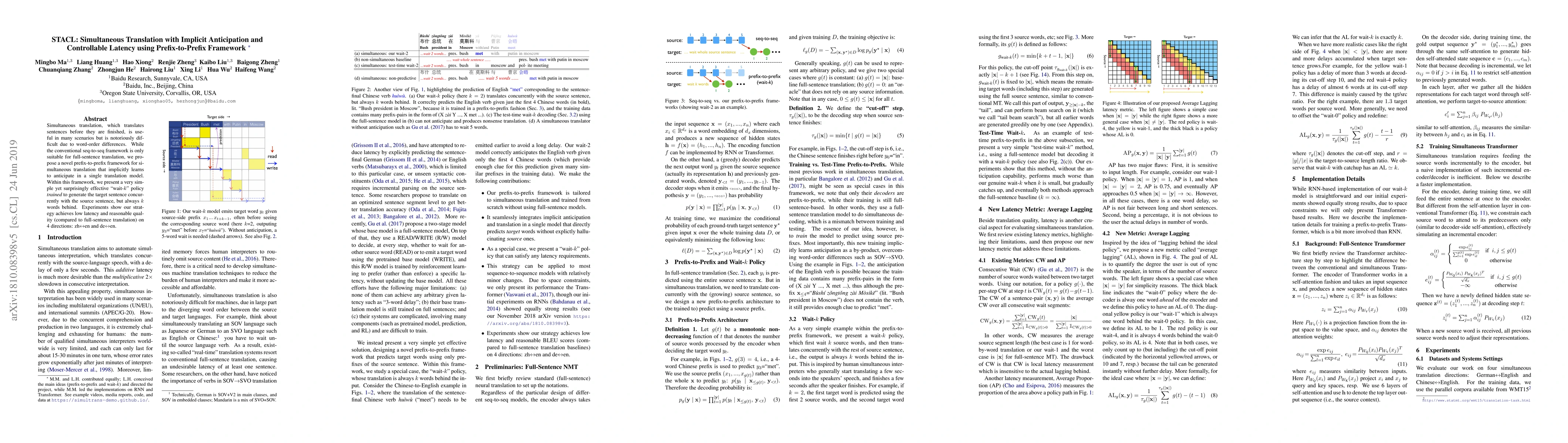 The paper proposes a prefix-to-prefix framework for simultaneous translation that anticipates and controls latency by generating target sentences k words behind the source. Experiments demonstrate that the method achieves low latency and acceptable translation quality for Chinese-English and German-English pairs.