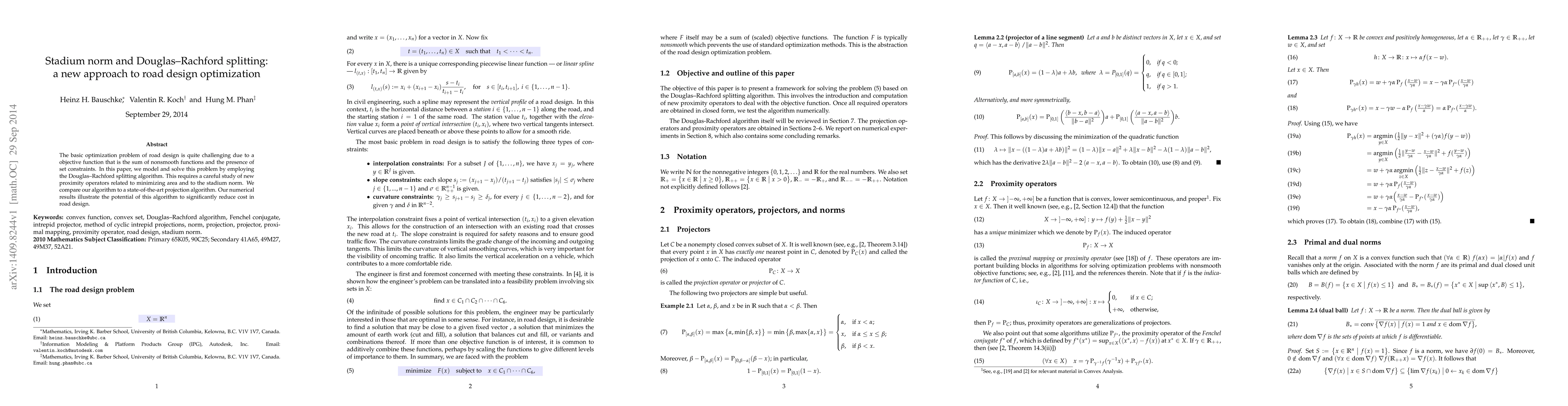 The basic optimization problem of road design is quite challenging due to a objective function that is the sum of nonsmooth functions and the presence of set constraints. In this paper, we model and solve this problem by employing the Douglas-Rachford splitting algorithm. This requires a careful study of new proximity operators related to minimizing area and to the stadium norm. We compare our algorithm to a state-of-the-art projection algorithm. Our numerical results illustrate the potential of this algorithm to significantly reduce cost in road design.