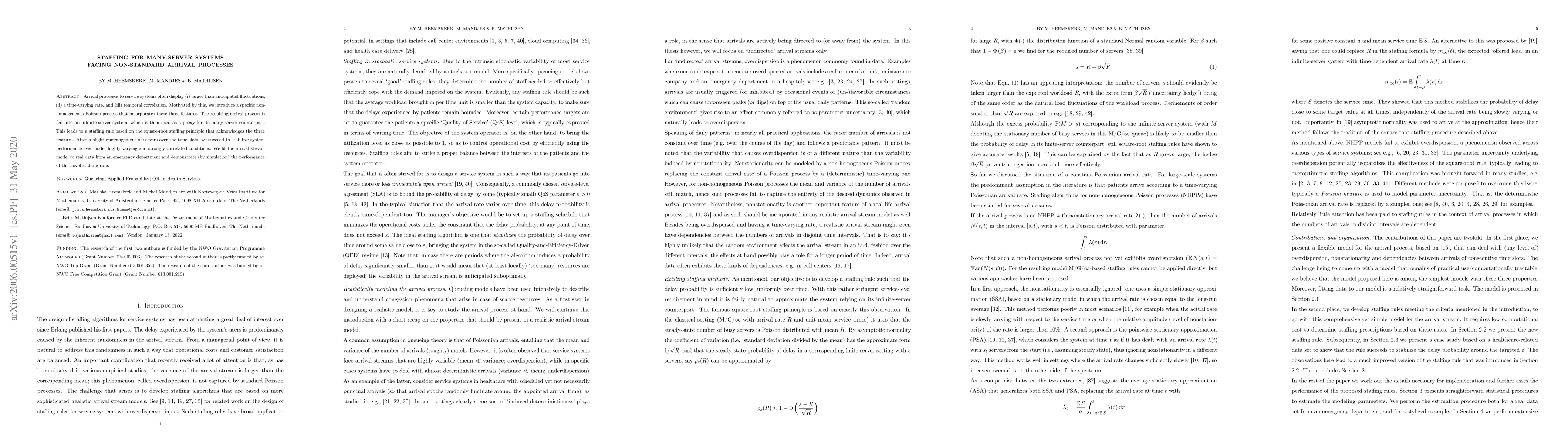 The paper presents a specific non-homogeneous Poisson process model and a staffing rule that accounts for non-standard arrival processes in many-server systems, extending existing staffing principles.