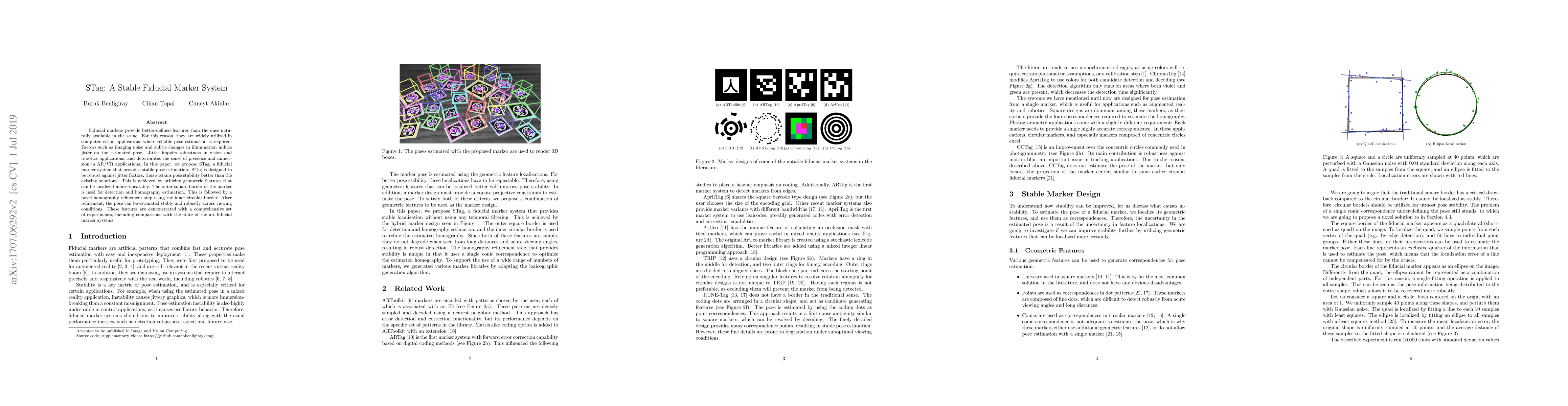 The paper introduces STag, a fiducial marker system designed to provide stable and robust pose estimation by utilizing geometric features for repeatable localization, including an outer square border and an inner circular border for homography refinement, outperforming existing solutions in stability against jitter.