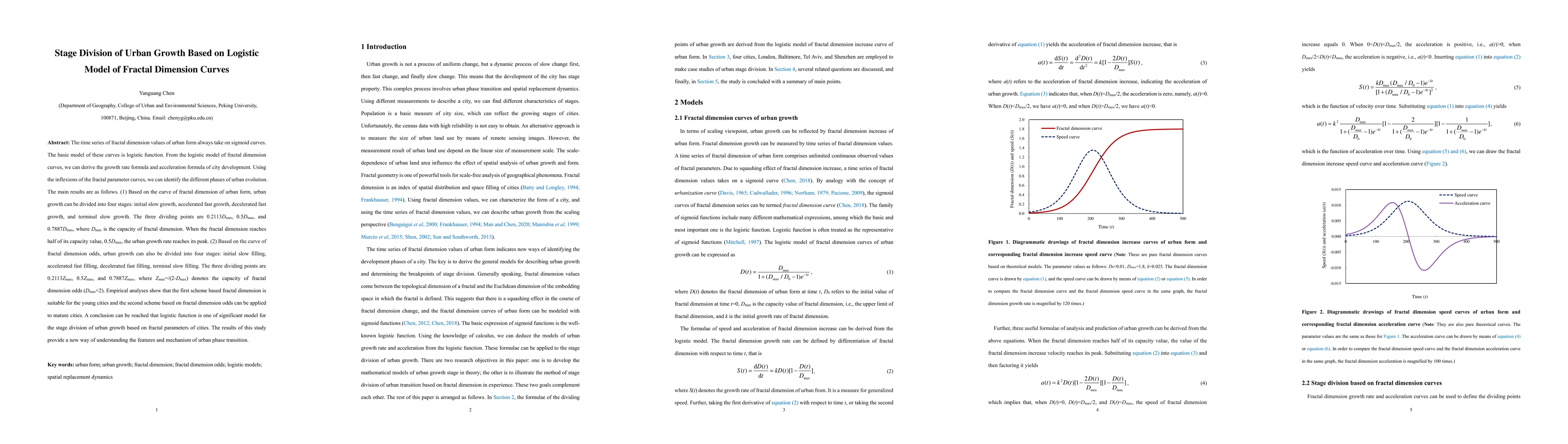 The time series of fractal dimension values of urban form always take on sigmoid curves. The basic model of these curves is logistic function. From the logistic model of fractal dimension curves, we can derive the growth rate formula and acceleration formula of city development. Using the inflexions of the fractal parameter curves, we can identify the different phases of urban evolution. The main results are as follows. (1) Based on the curve of fractal dimension of urban form, urban growth can be divided into four stages: initial slow growth, accelerated fast growth, decelerated fast growth, and terminal slow growth. The three dividing points are 0.2113Dmax, 0.5Dmax, and 0.7887Dmax, where Dmax is the capacity of fractal dimension. When the fractal dimension reaches half of its capacity value, 0.5Dmax, the urban growth rate reaches its peak. (2) Based on the curve of fractal dimension odds, urban growth can also be divided into four stages: initial slow filling, accelerated fast filling, decelerated fast filling, terminal slow filling. The three dividing points are 0.2113Zmax, 0.5Zmax, and 0.7887Zmax, where Zmax=/(2-Dmax) denotes the capacity of fractal dimension odds (Dmax<2). Empirical analyses show that the first scheme based fractal dimension is suitable for the young cities and the second scheme based on fractal dimension odds can be applied to mature cities. A conclusion can be reached that logistic function is one of significant model for the stage division of urban growth based on fractal parameters of cities. The results of this study provide a new way of understanding the features and mechanism of urban phase transition.