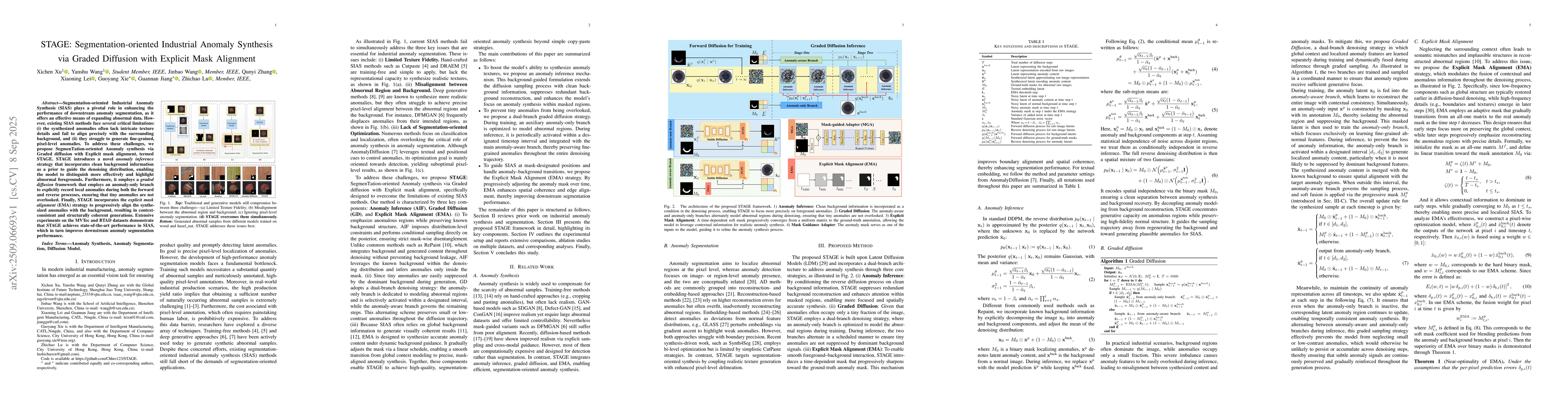 Segmentation-oriented Industrial Anomaly Synthesis (SIAS) plays a pivotal role in enhancing the performance of downstream anomaly segmentation, as it provides an effective means of expanding abnormal data. However, existing SIAS methods face several critical limitations: (i) the synthesized anomalies often lack intricate texture details and fail to align precisely with the surrounding background, and (ii) they struggle to generate fine-grained, pixel-level anomalies. To address these challenges, we propose Segmentation-oriented Anomaly synthesis via Graded diffusion with Explicit mask alignment, termed STAGE. STAGE introduces a novel anomaly inference strategy that incorporates clean background information as a prior to guide the denoising distribution, enabling the model to more effectively distinguish and highlight abnormal foregrounds. Furthermore, it employs a graded diffusion framework with an anomaly-only branch to explicitly record local anomalies during both the forward and reverse processes, ensuring that subtle anomalies are not overlooked. Finally, STAGE incorporates the explicit mask alignment (EMA) strategy to progressively align the synthesized anomalies with the background, resulting in context-consistent and structurally coherent generations. Extensive experiments on the MVTec and BTAD datasets demonstrate that STAGE achieves state-of-the-art performance in SIAS, which in turn enhances downstream anomaly segmentation.