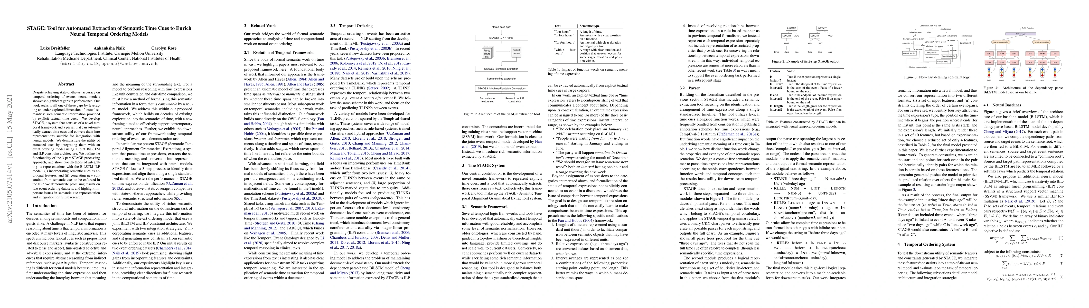 Despite achieving state-of-the-art accuracy on temporal ordering of events, neural models showcase significant gaps in performance. Our work seeks to fill one of these gaps by leveraging an under-explored dimension of textual semantics: rich semantic information provided by explicit textual time cues. We develop STAGE, a system that consists of a novel temporal framework and a parser that can automatically extract time cues and convert them into representations suitable for integration with neural models. We demonstrate the utility of extracted cues by integrating them with an event ordering model using a joint BiLSTM and ILP constraint architecture. We outline the functionality of the 3-part STAGE processing approach, and show two methods of integrating its representations with the BiLSTM-ILP model: (i) incorporating semantic cues as additional features, and (ii) generating new constraints from semantic cues to be enforced in the ILP. We demonstrate promising results on two event ordering datasets, and highlight important issues in semantic cue representation and integration for future research.